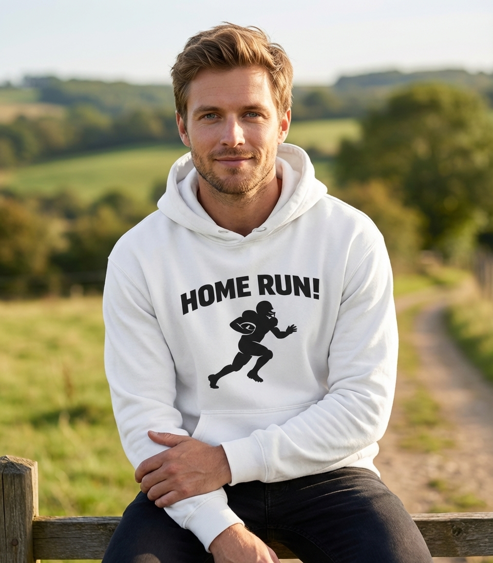 The "HOME RUN!" phrase captures the unexpected excitement of passionate football fans who enjoy a great play, a fun game day, and sports humor.