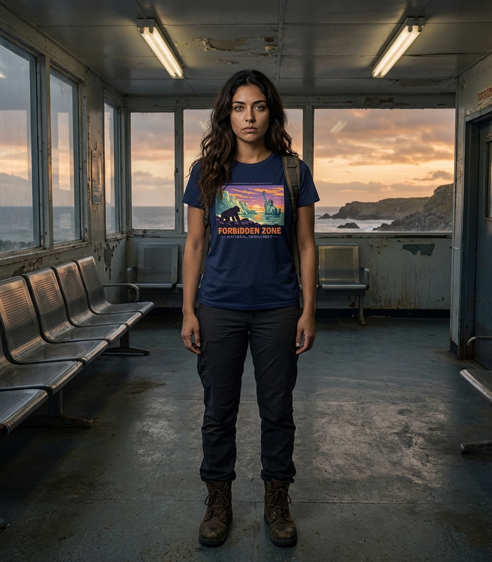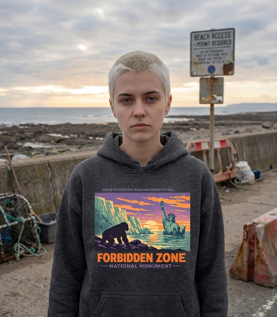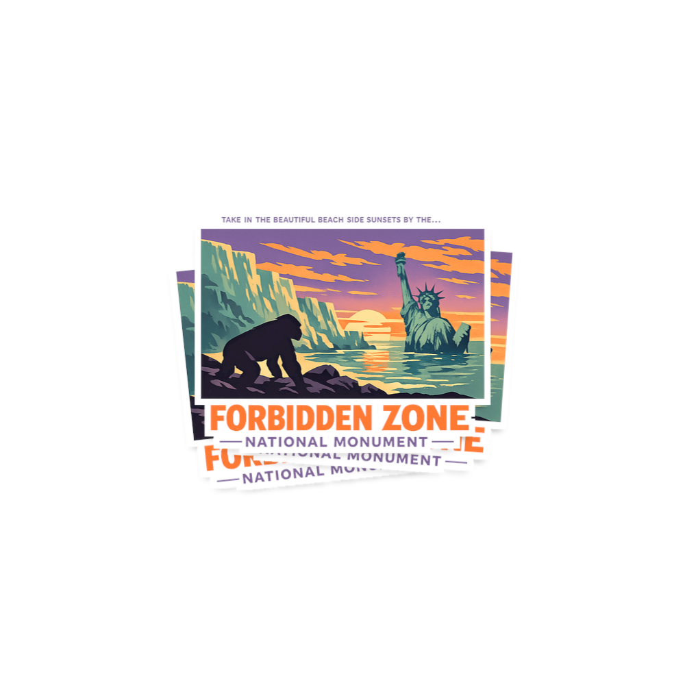 The aesthetic evokes vintage travel posters with a dark, satirical twist, proclaiming the scene as the 'Forbidden Zone National Monument'.