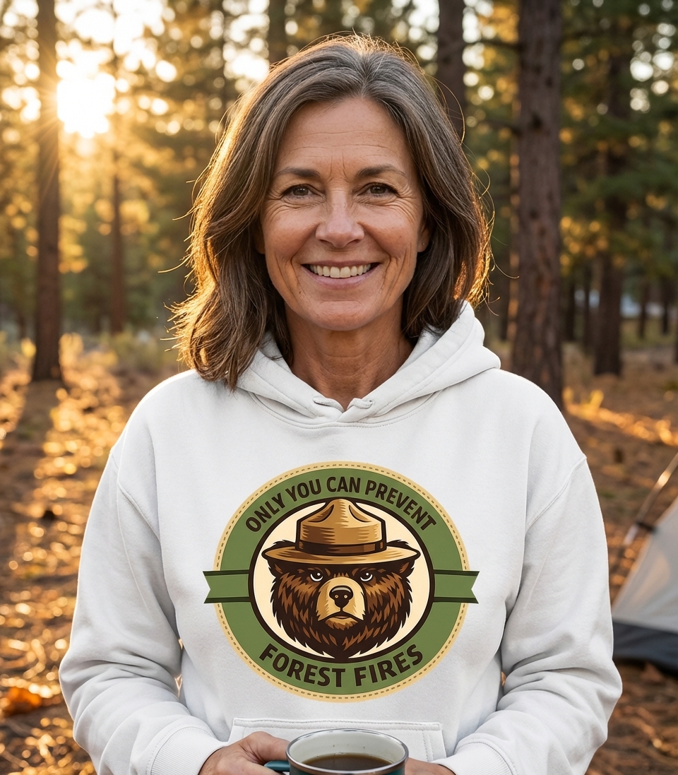 The "Only You Can Prevent Forest Fires" phrase captures the lifestyle of passionate outdoor enthusiasts who spend their days hiking, camping, and protecting natural environments.
