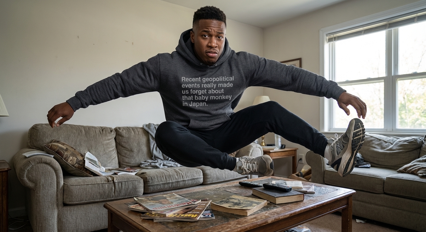 This phrase encapsulates a common sentiment where people look back at past minor news items, like a "baby monkey in Japan," realizing how quickly they were forgotten due to more pressing global developments. It highlights the fleeting public memory for lighter news amidst serious geopolitical discussions.