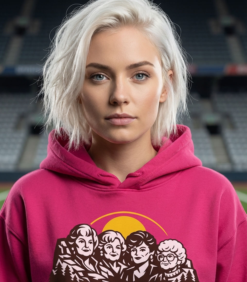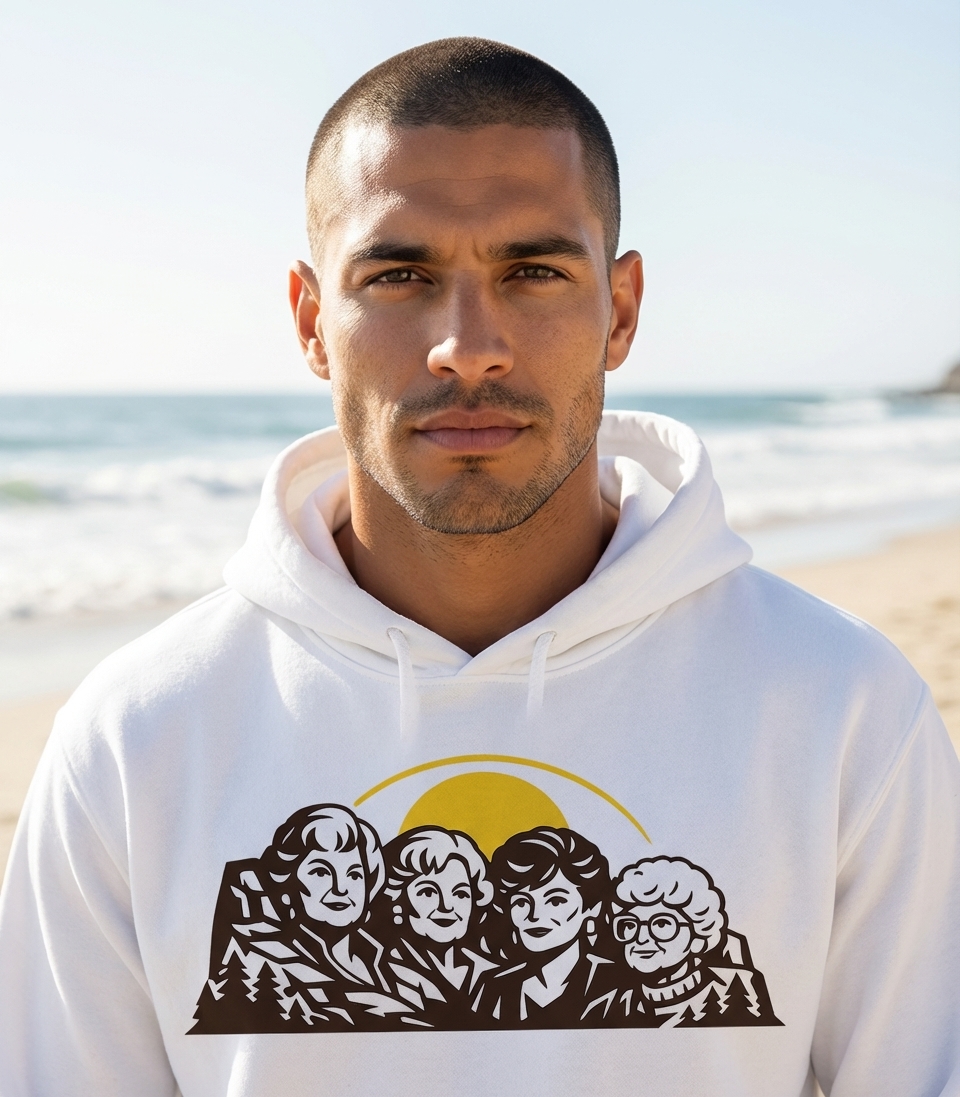 This design presents a creative parody of Mount Rushmore, featuring the beloved faces of four legendary women from a classic television sitcom. Set against a rising sun and framed by pine trees, the artwork transforms an iconic monument into a tribute to enduring friendship and humor.