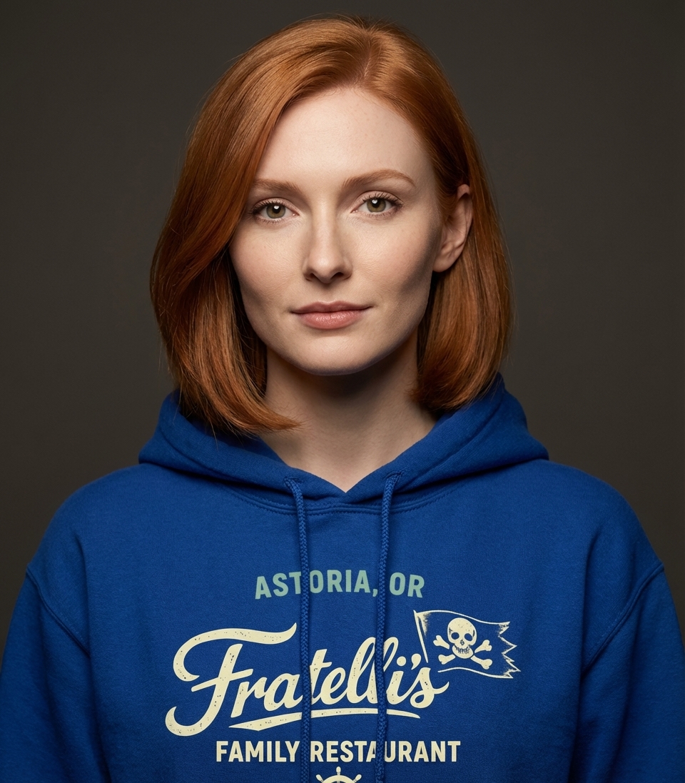 This graphic tee showcases a vintage-inspired logo for "Fratelli's Family Restaurant" in Astoria, Oregon. The design features classic distressed typography, nautical accents like a ship's wheel, and a distinctive pirate flag with a skull and crossbones. The inclusion of "ESTD. 1985" grounds the design in a specific era, evoking a sense of nostalgia.