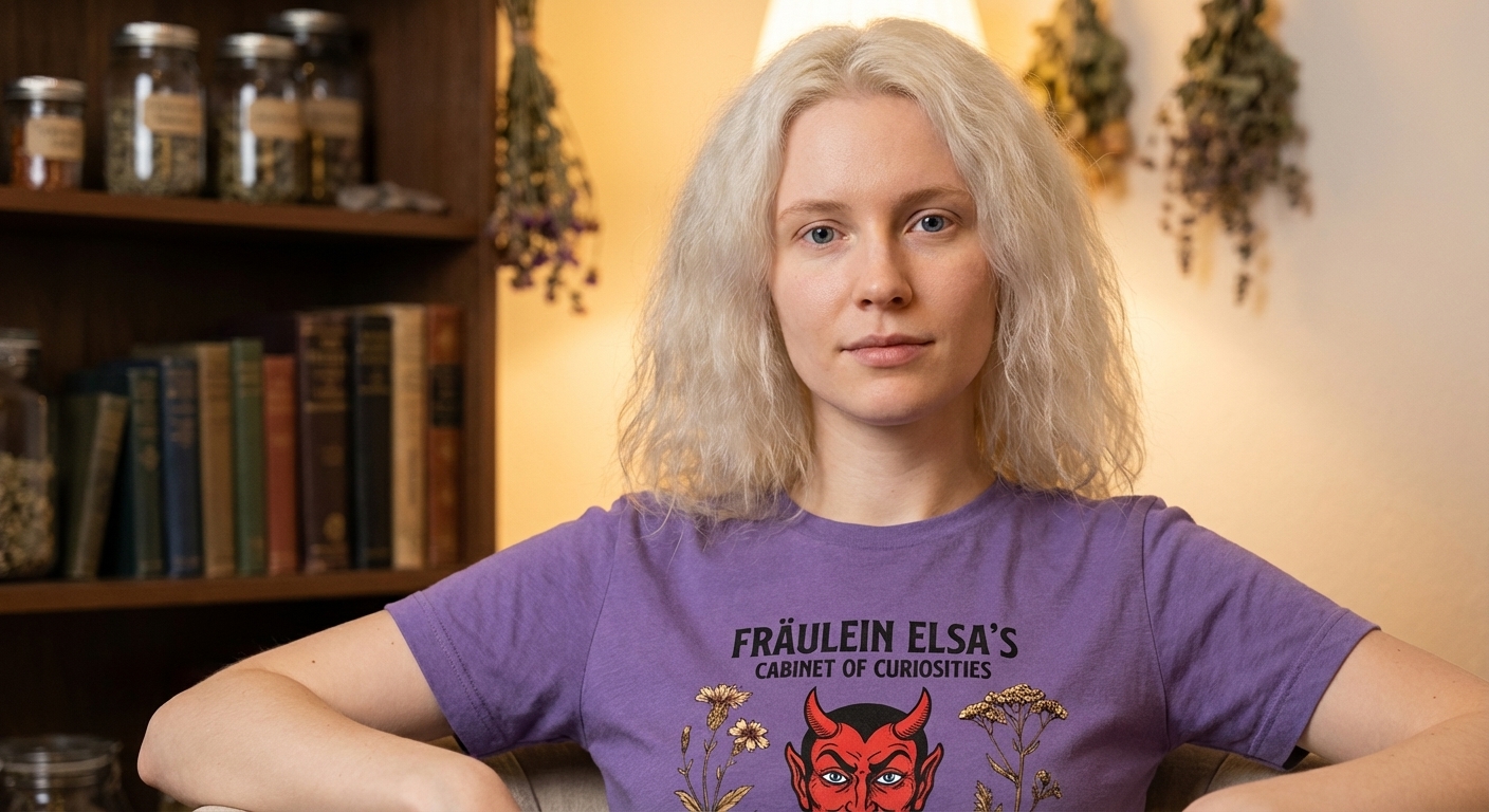 This striking graphic features a stylized, mischievous jester or devil-like figure at its center, embodying a sense of playful mystery. Above, a vintage banner proclaims "Fräulein Elsa's," while below, the intriguing phrase "Cabinet of Curiosities" completes the theme. Botanical elements, resembling dried herbs and gourds, flank the central figure, adding to the rustic and antiquated charm.