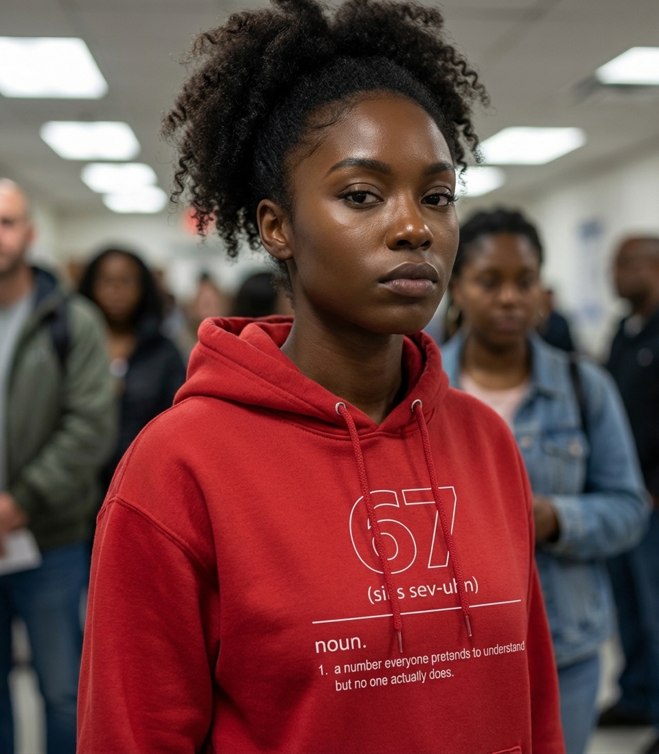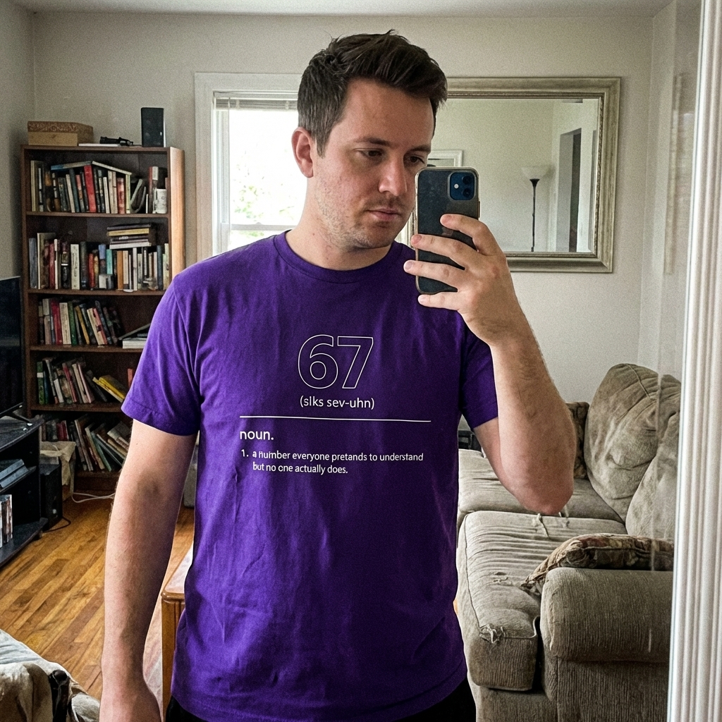 This design cleverly defines the number 67, capturing the shared experience of pretending to understand complex concepts.