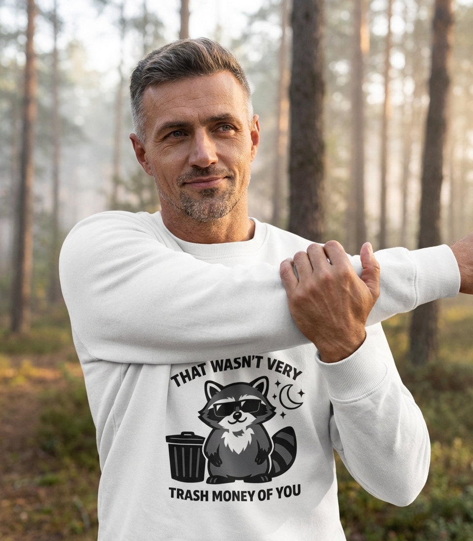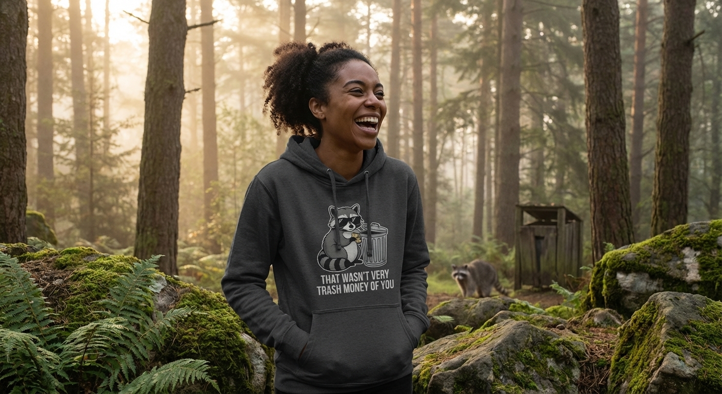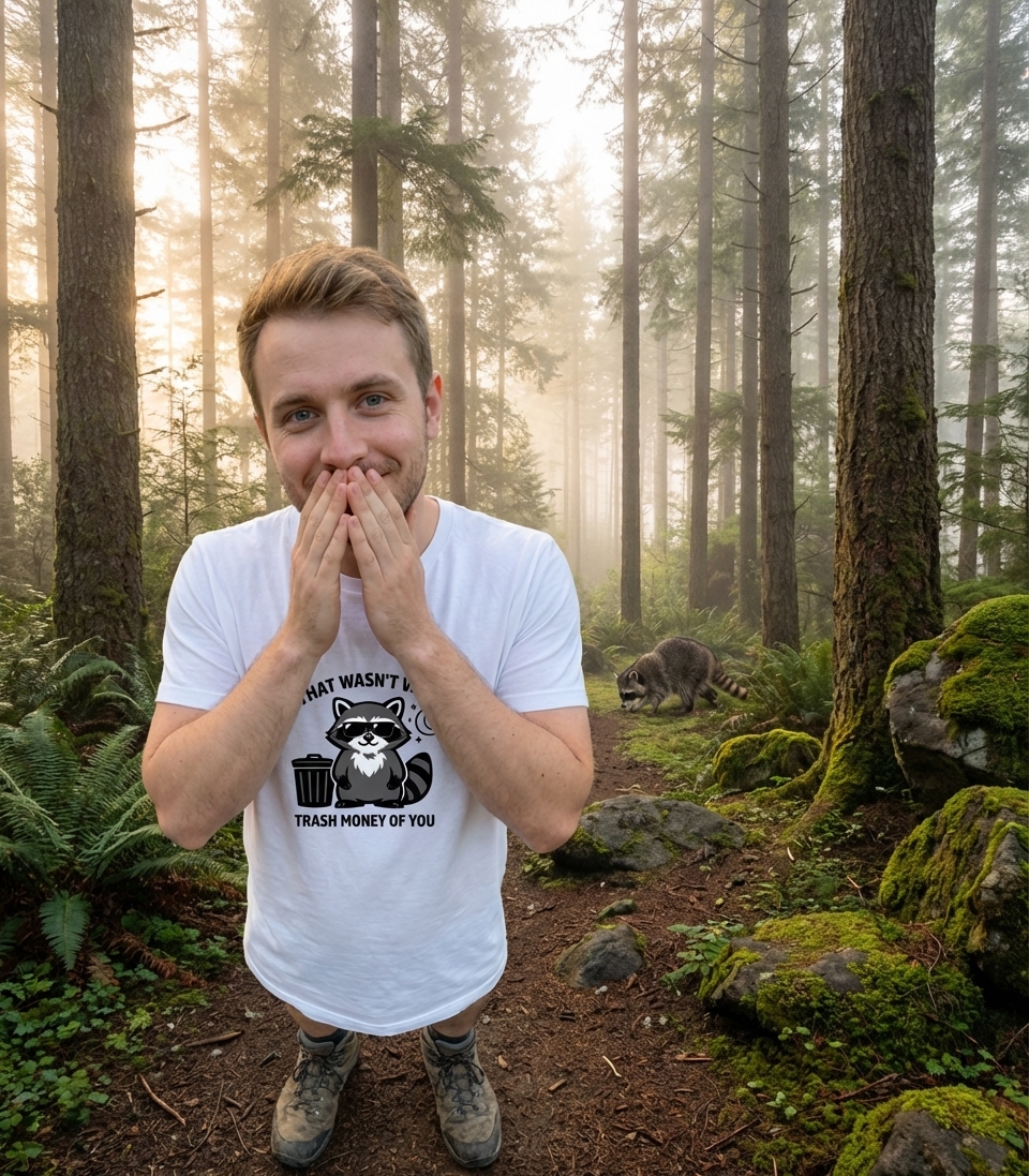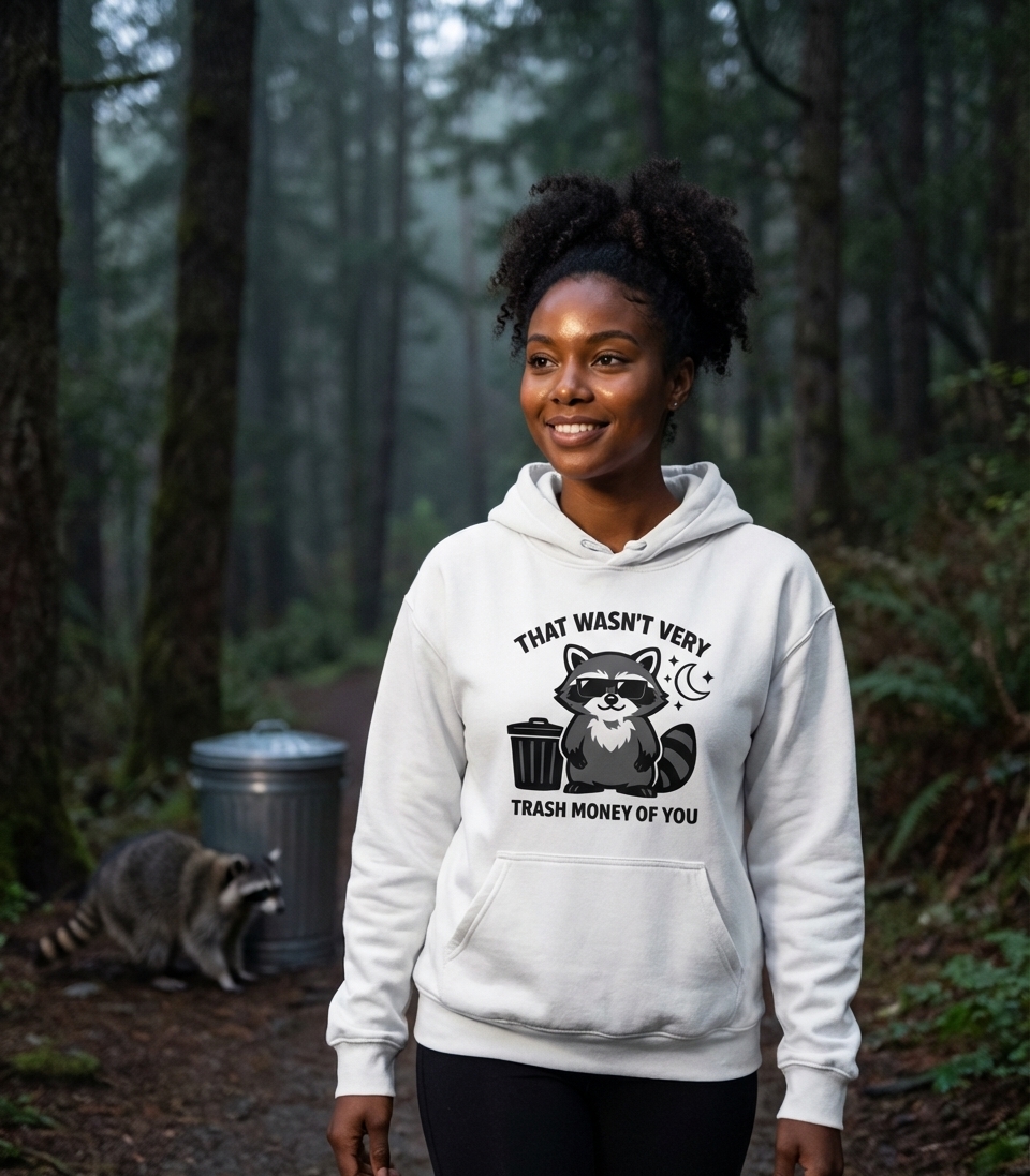 This humorous graphic features a cute, stylized raccoon standing proudly next to a trash can. The design playfully embraces the raccoon's common nickname, "trash panda," with a clever twist on words.