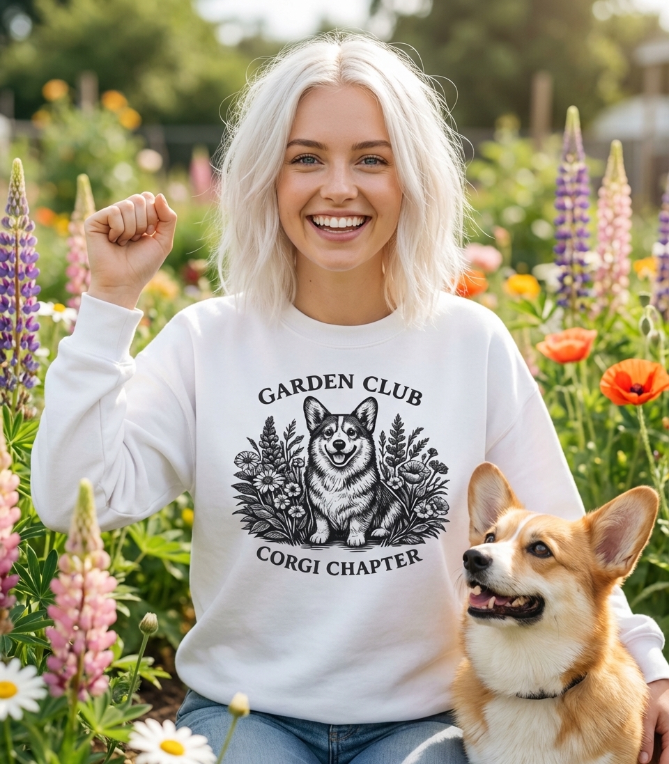 The "Corgi Garden Club Chapter" design captures the joyful spirit of dog lovers and gardening enthusiasts who cherish their pets and cultivate beautiful botanical spaces.