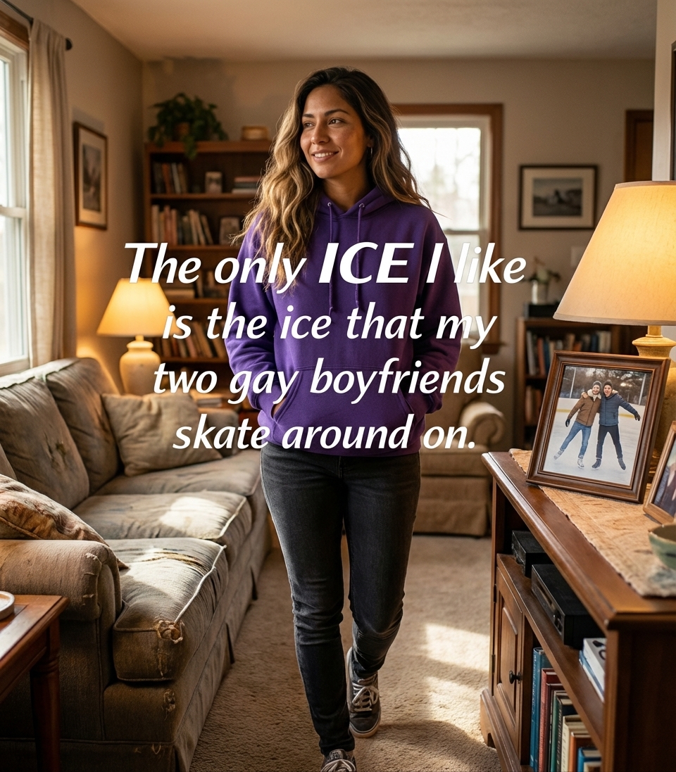 The core phrase "The only ICE I like is the ice that my two gay boyfriends skate around on" is a witty declaration. It serves as a lighthearted jab, redirecting the meaning of "ICE" from an organizational acronym to the recreational surface, while proudly celebrating a polyamorous gay relationship and a shared love for ice sports.