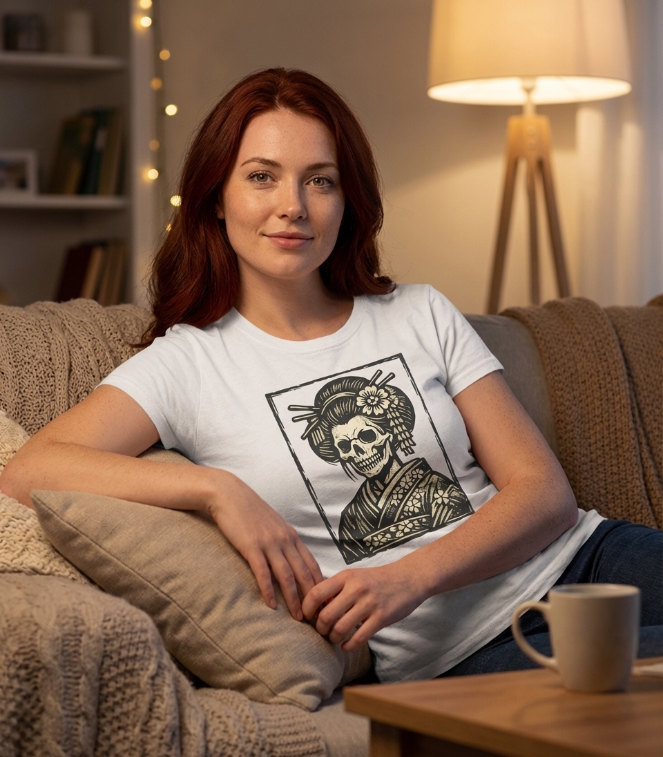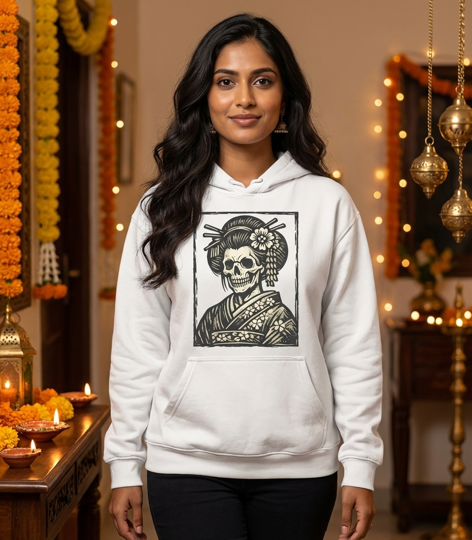 This striking graphic presents a unique fusion of traditional Japanese artistry and a gothic aesthetic. It showcases a geisha figure reimagined as a skull, adorned with an elaborate coiffure featuring elegant hairpins and a delicate floral accessory. The kimono is patterned with beautiful cherry blossoms, adding a layer of cultural depth to the macabre theme.