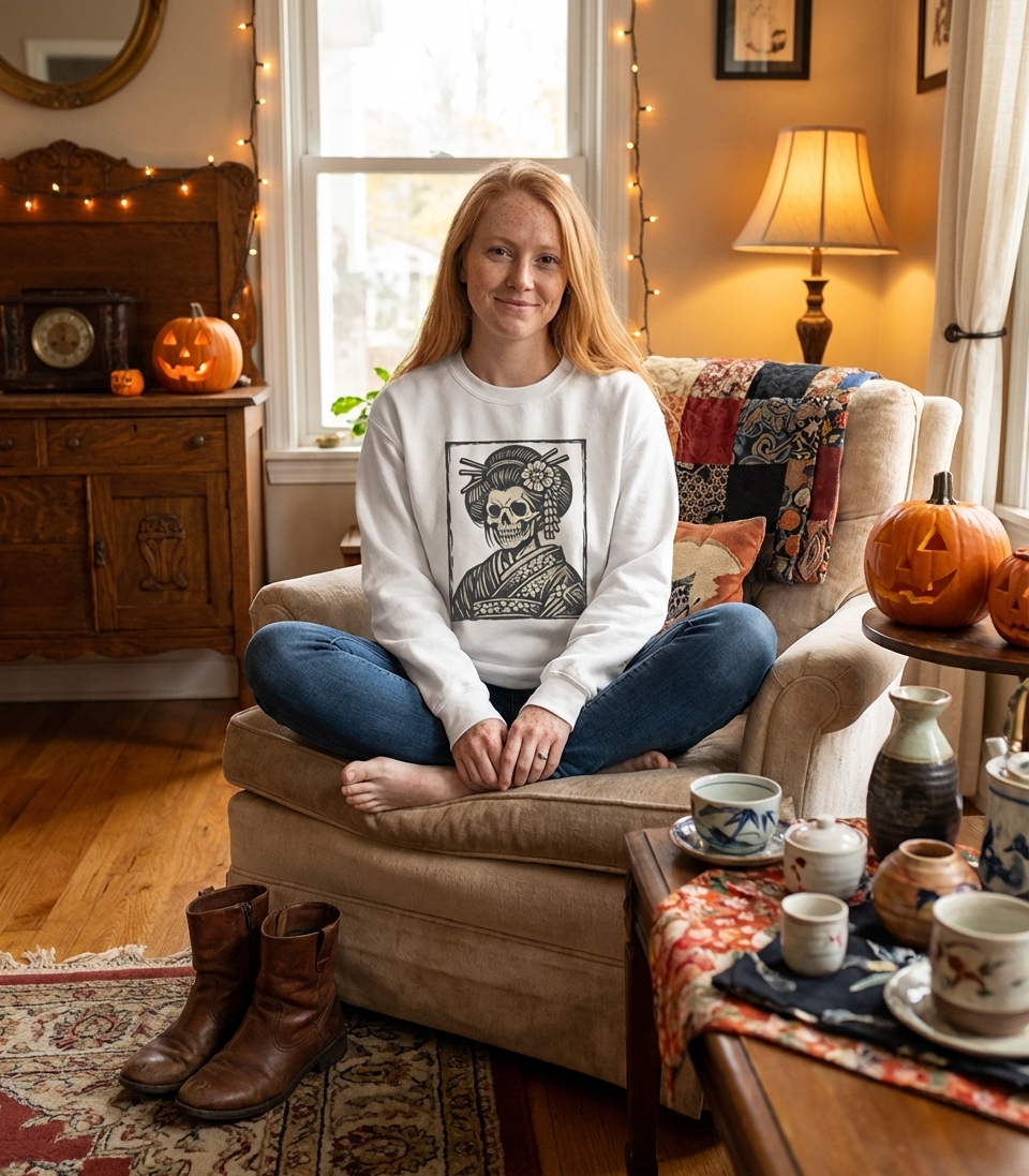 This captivating design blends traditional Japanese elegance with a haunting, macabre twist, appealing to those who appreciate unique artistic fusions.