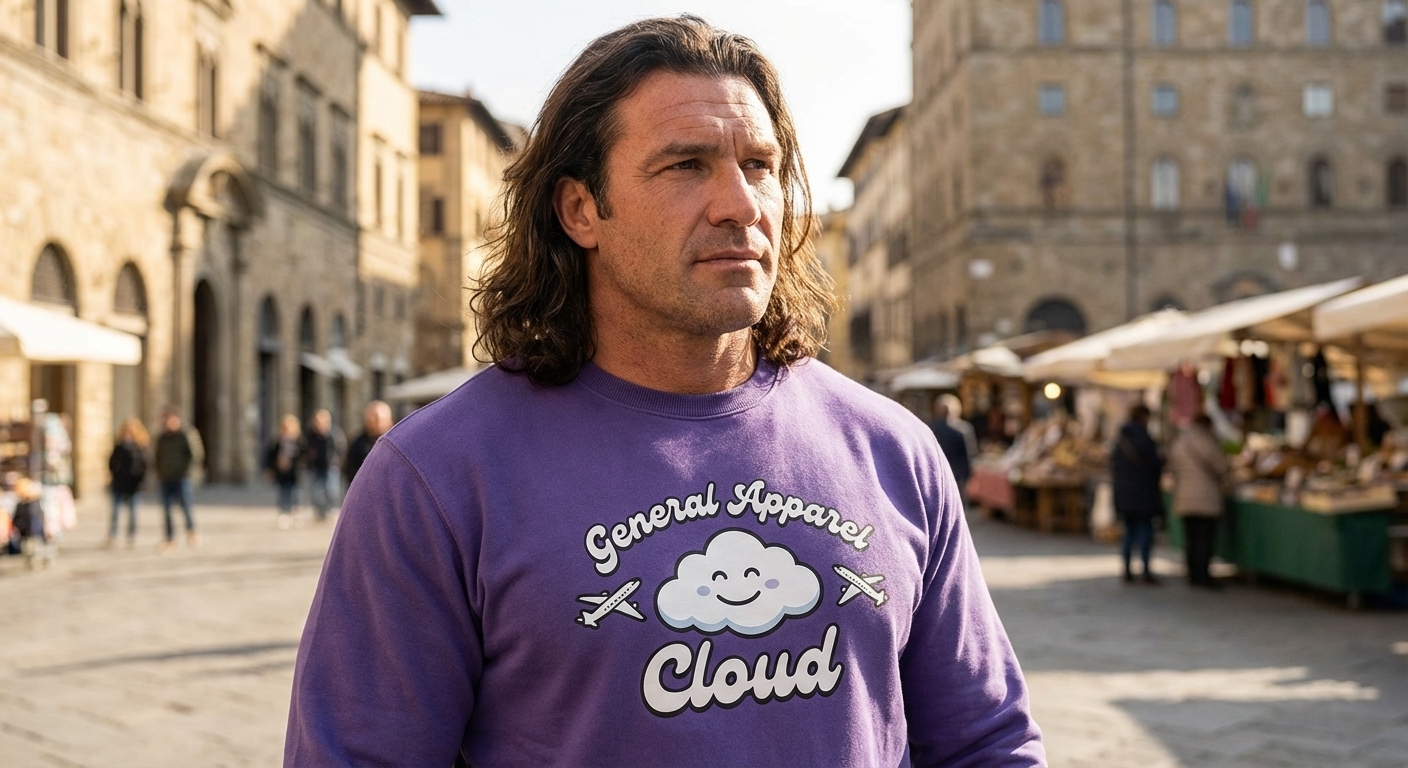 The phrase 'General Apparel' acts as a clear identifier, likely representing a clothing brand. Combined with the playful visual, it suggests a brand focused on accessible, everyday wear with a cheerful and inviting aesthetic.