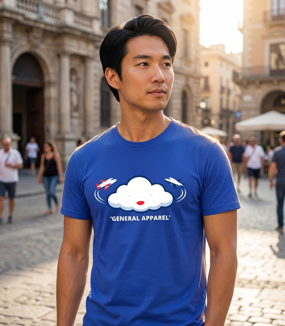 This charming graphic features a friendly, cartoon cloud with a wide smile and rosy cheeks. Two stylized airplanes, one red and white, the other blue and white, cheerfully loop around the cloud, leaving whimsical white trails. The text ''GENERAL APPAREL'' is prominently displayed below, identifying the brand or theme.