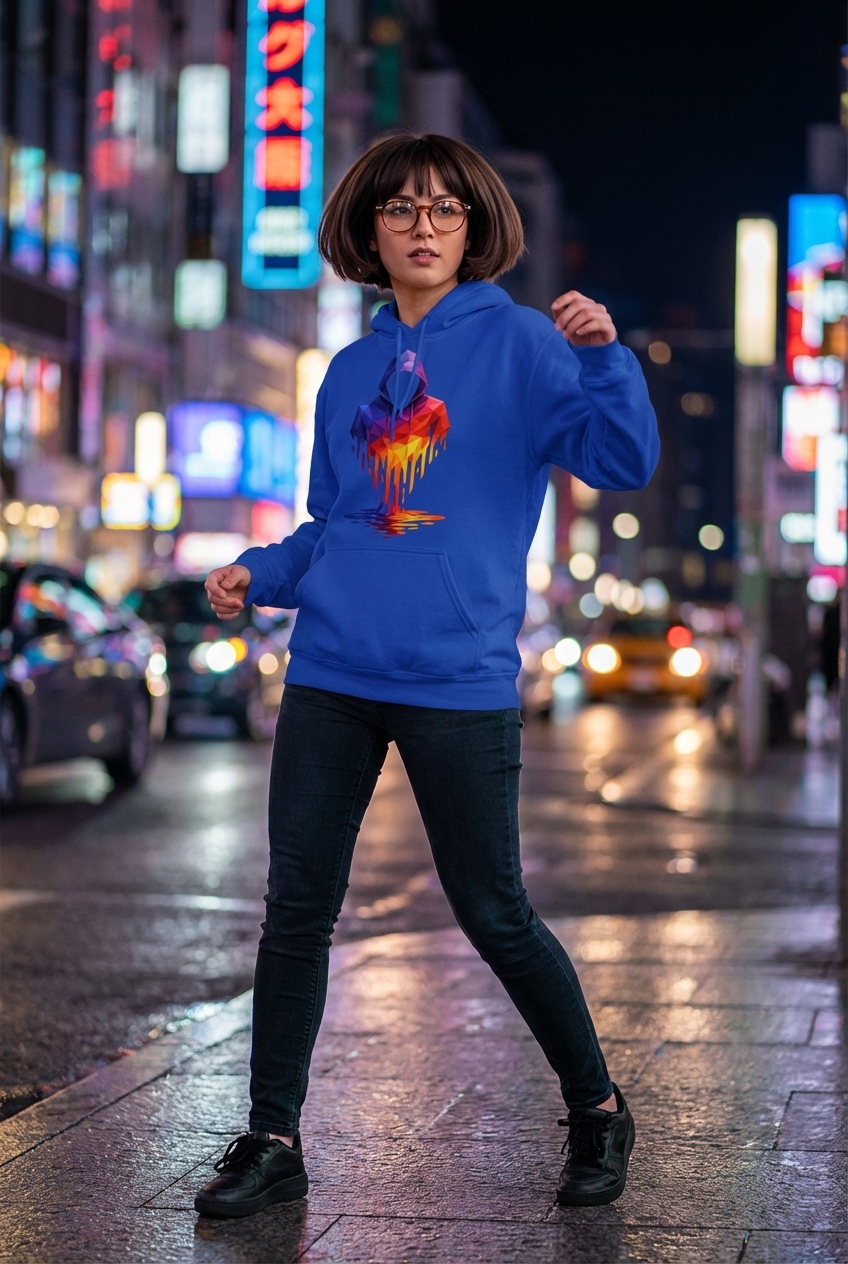 This striking graphic features a hooded figure rendered in a captivating low-poly, geometric style. The vibrant rainbow gradient transitions across the figure, creating a dynamic and modern visual. Below, the design dramatically melts into a colorful puddle, reflecting the rich hues above.
