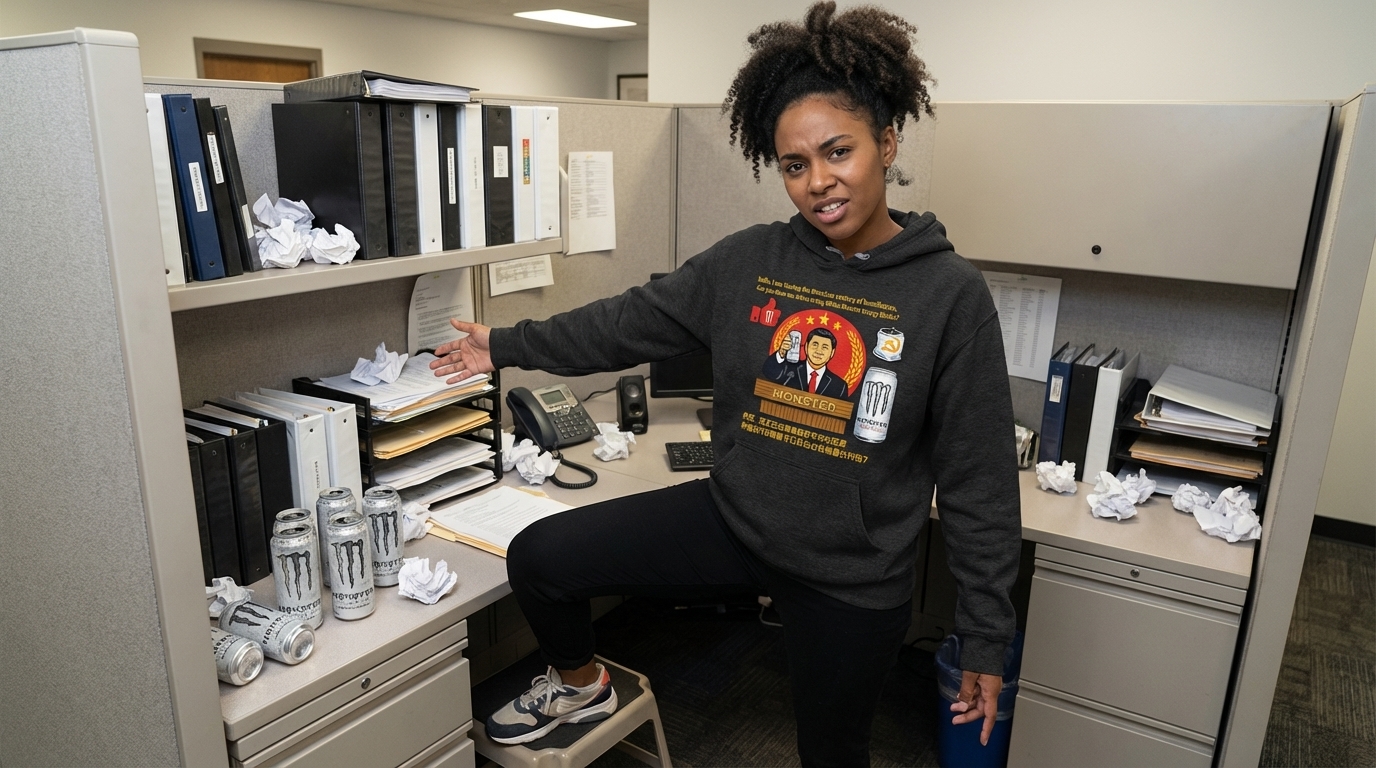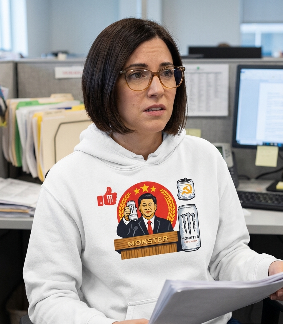 This provocative graphic humorously depicts a global leader, holding an altered energy drink can, set against a backdrop referencing a national emblem. The design merges political commentary with pop culture elements to deliver a sharp, satirical statement on global affairs.