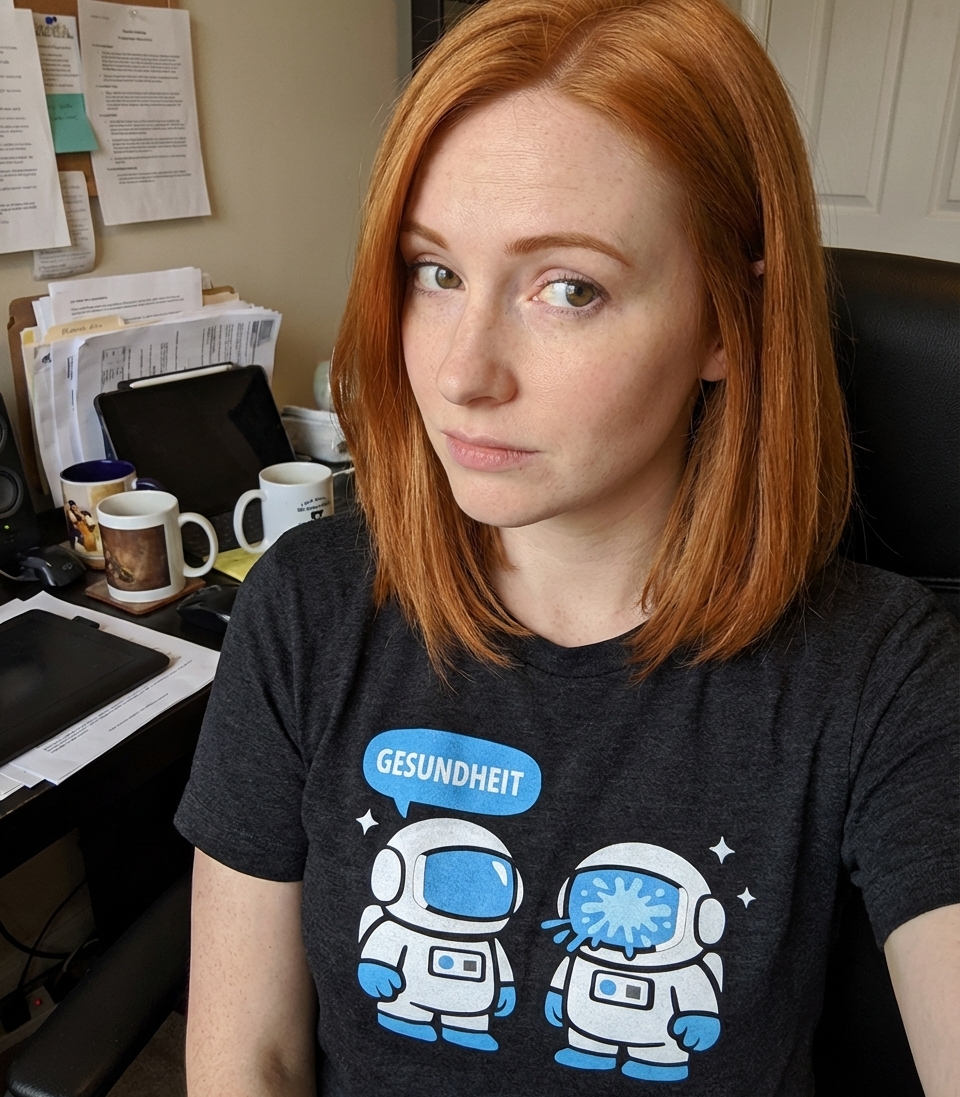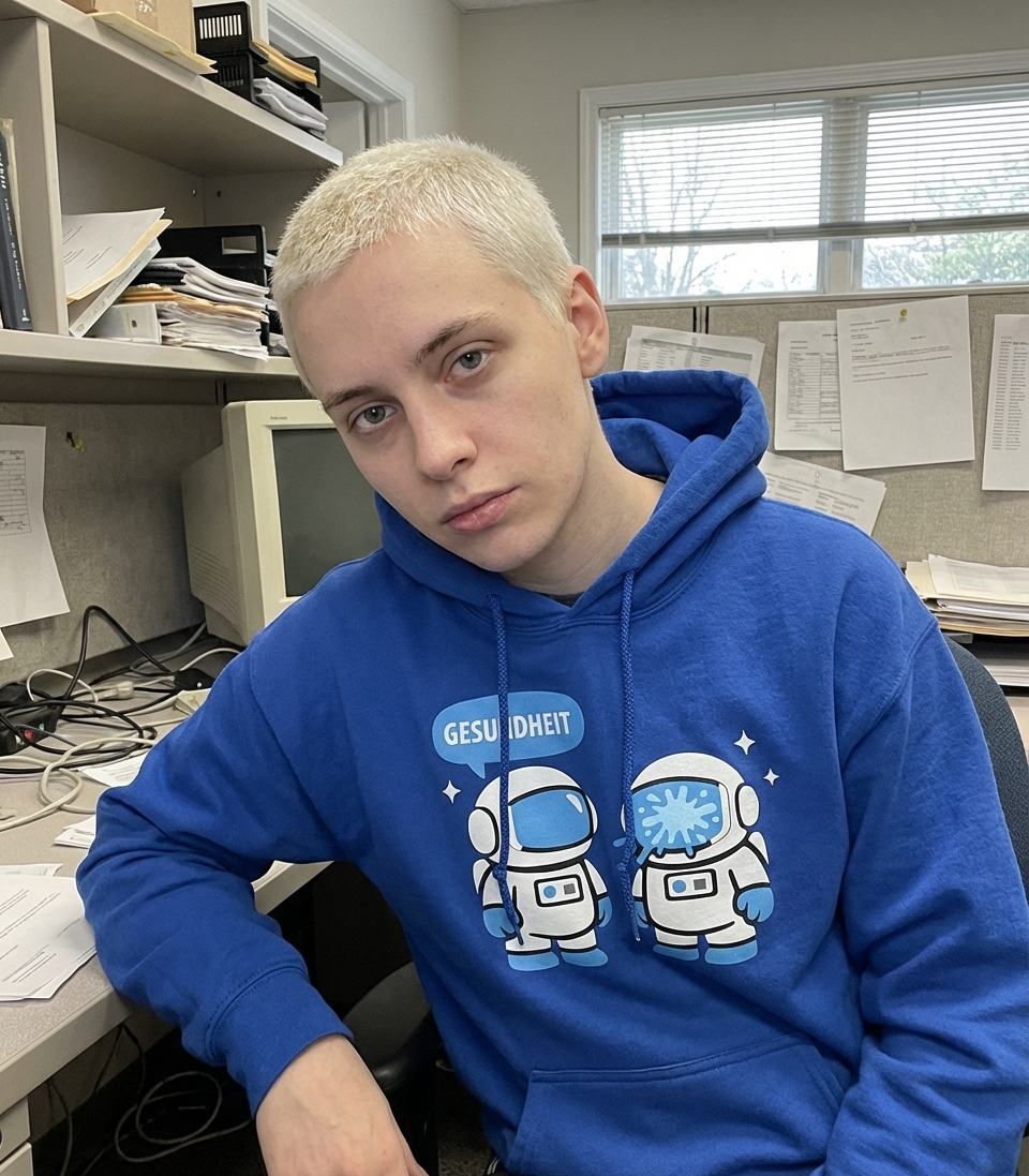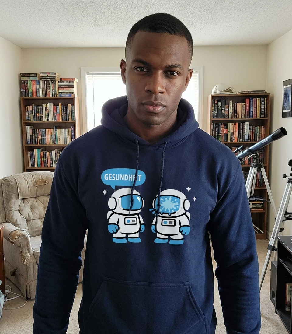 The 'Gesundheit' phrase captures the lifestyle of quirky space enthusiasts who love science fiction, clever puns, and out-of-this-world humor.