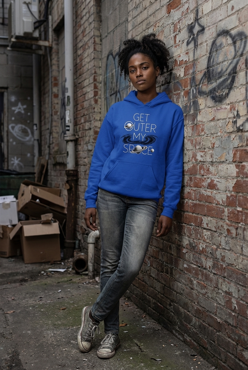 The phrase "Get Outer My Space" is a clever pun on the common idiom "Get out of my space." It humorously expresses a desire for personal boundaries, often appealing to those who appreciate quiet time or a sense of individuality.