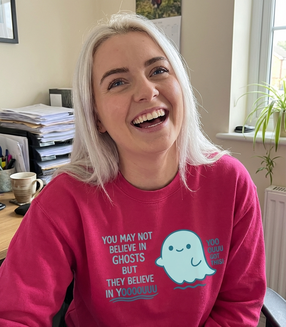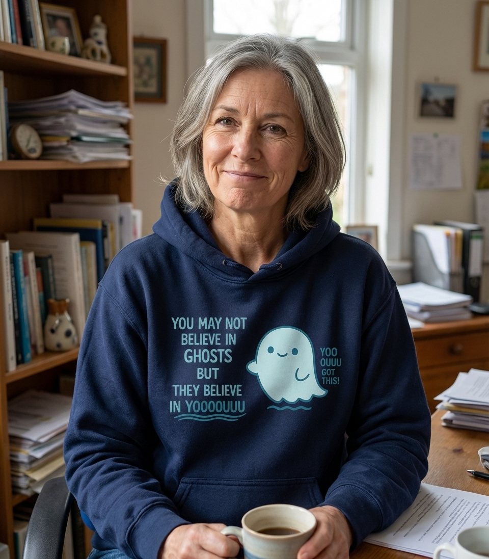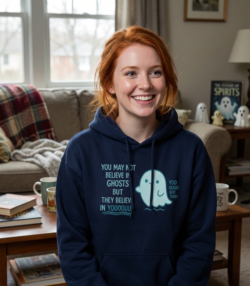 The main phrase, "YOU MAY NOT BELIEVE IN GHOSTS BUT THEY BELIEVE IN YOOOOOUUUU," is a clever twist on self-belief, offering a lighthearted confidence boost. Paired with "YOO OUUU GOT THIS!", it creates a dual message of whimsical encouragement and unwavering support from an unexpected source.
