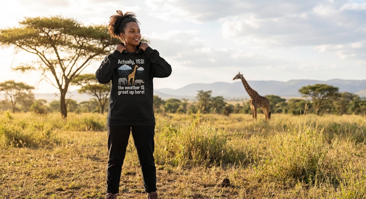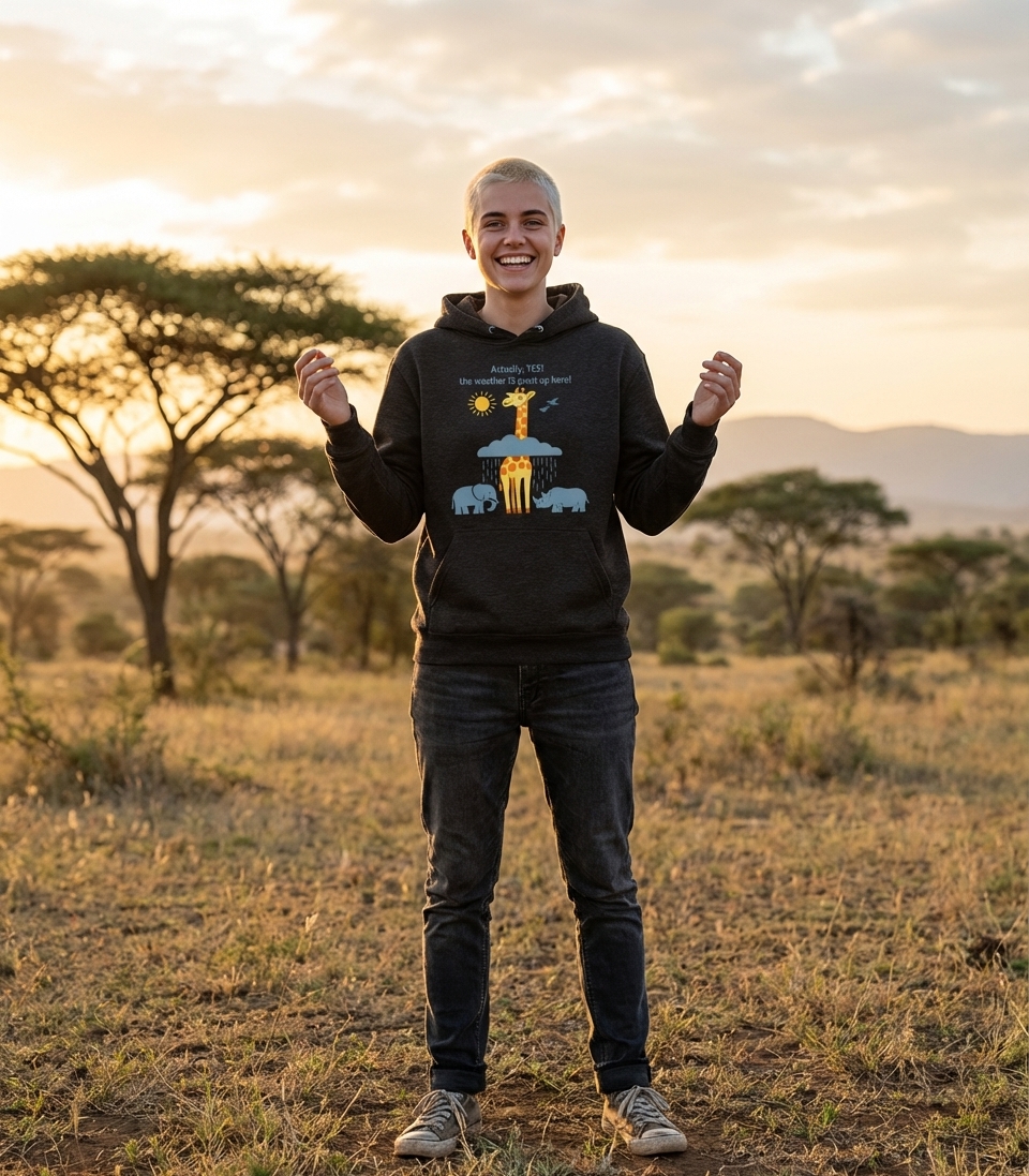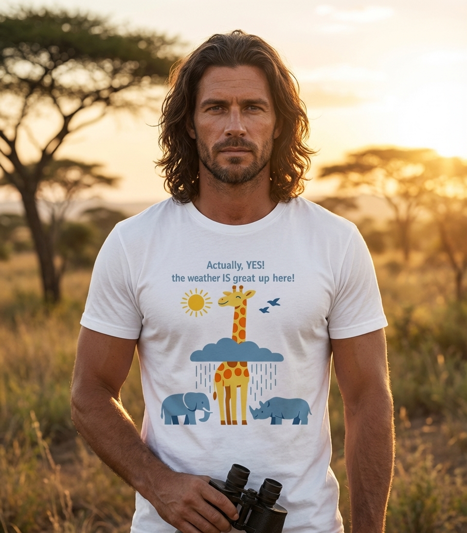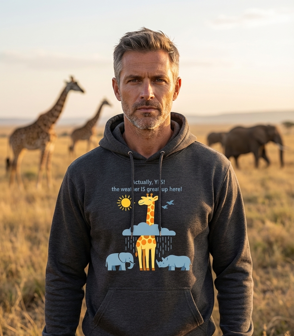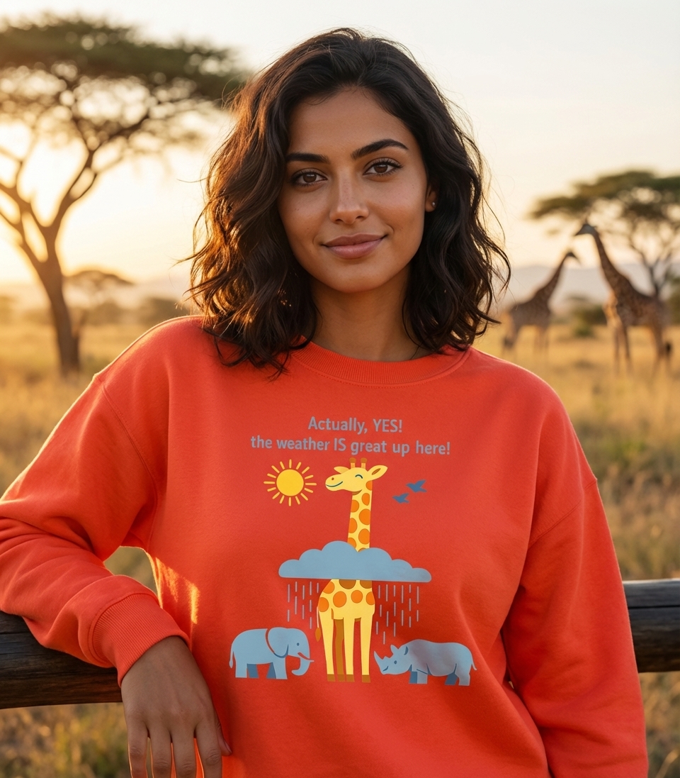 This design features a happy giraffe with its head in the bright sunshine, positioned humorously above a rain cloud. Below the cloud, an elephant and a rhino are visibly getting rained on. The artwork playfully illustrates how different heights can lead to vastly different experiences, even with the weather.