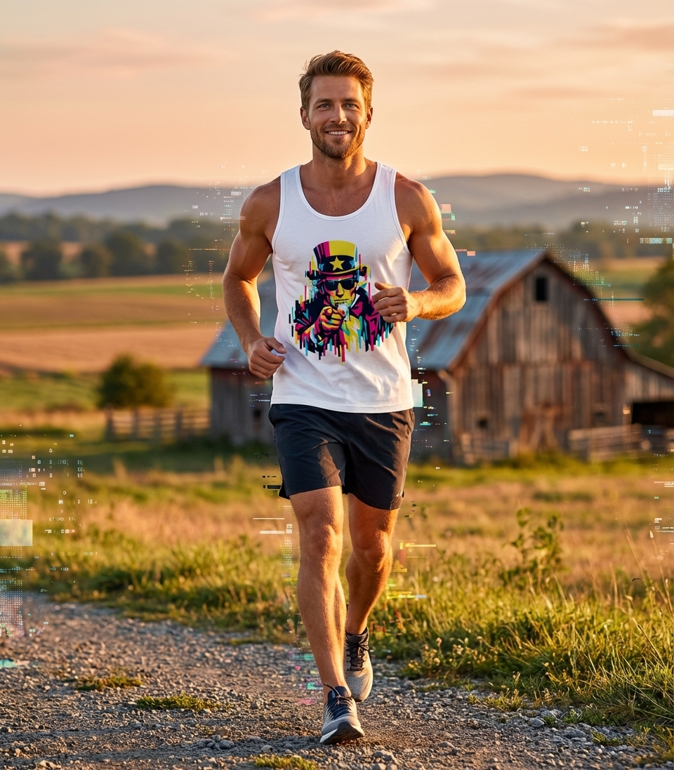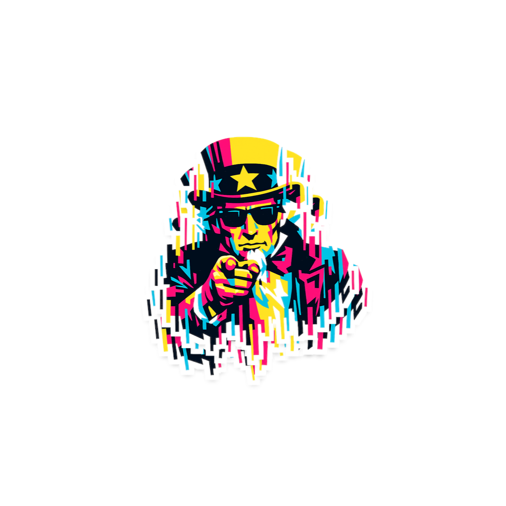 This striking graphic reinterprets the classic Uncle Sam image with a modern glitch art aesthetic. Vibrant colors and fragmented lines give a fresh, dynamic feel to this powerful patriotic symbol. The design evokes a sense of both tradition and contemporary artistic expression.