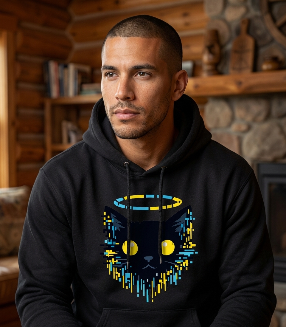 The visual combines the charm of feline companionship with a contemporary digital aesthetic and a touch of the ethereal. It suggests a guardian or angelic presence in a world increasingly intertwined with technology, making it perfect for those who see their pets as special, almost supernatural, companions.