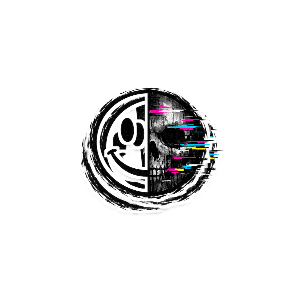 The artwork features a striking, half-rendered skull with a distressed, grungy texture. Vibrant, colored glitch lines disrupt the image, giving it a modern and dynamic digital effect. This design blends classic skeletal imagery with contemporary cyberpunk aesthetics.