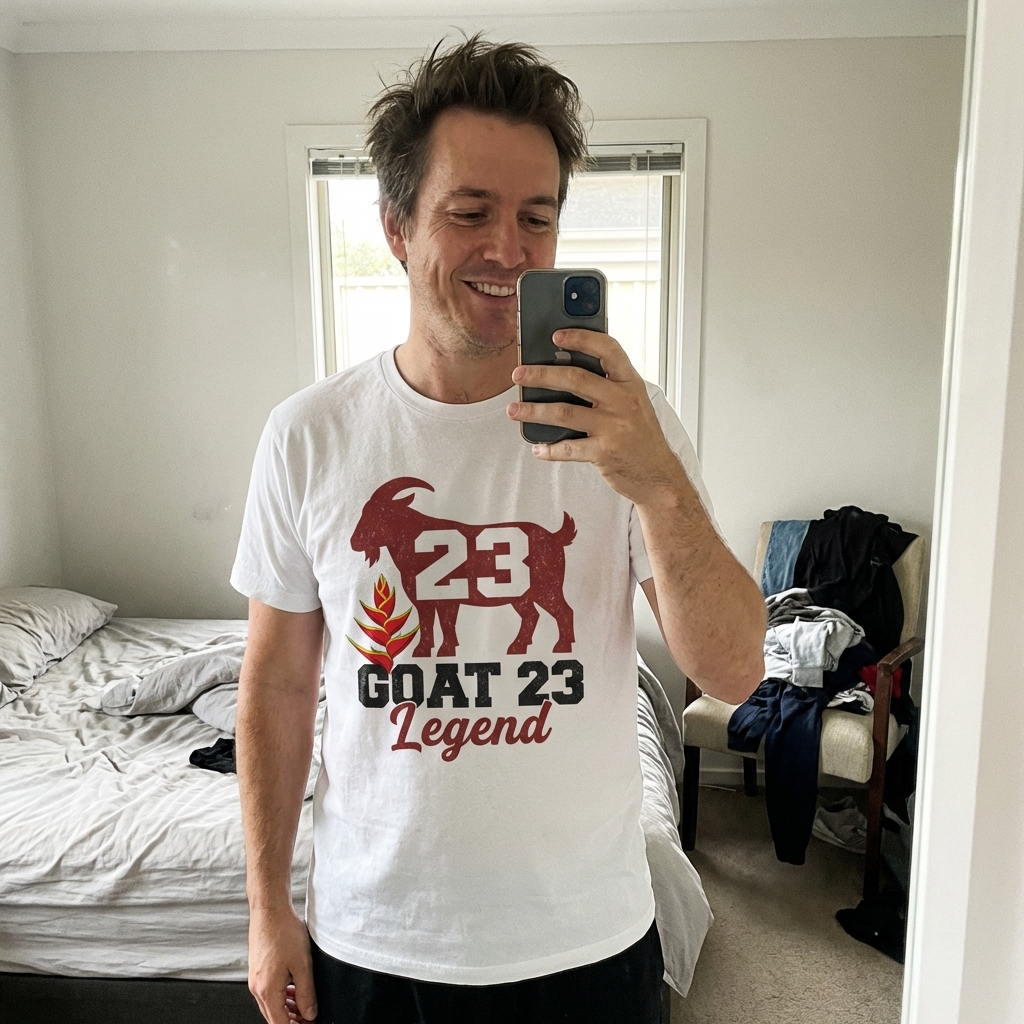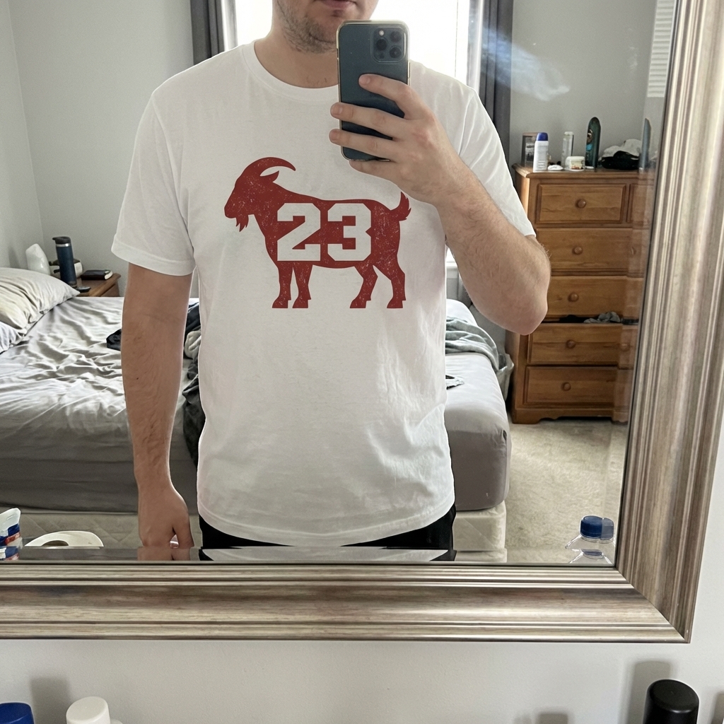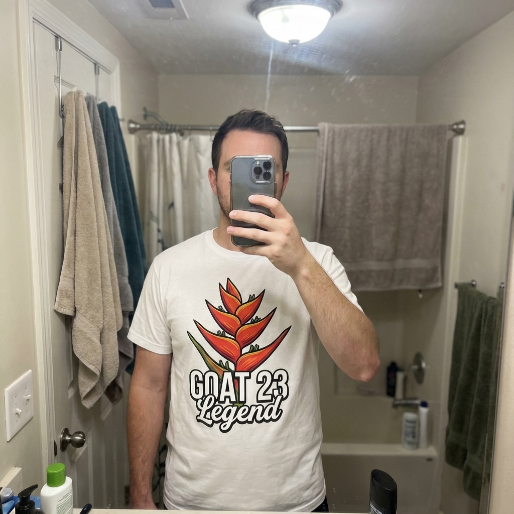 Got my "GOAT 23 Legend" shirt today and I'm totally diggin' it. The design is really sharp, kinda cool and understated, perfect for just chilling or heading out. Plus, it's super soft – good quality tee all around.