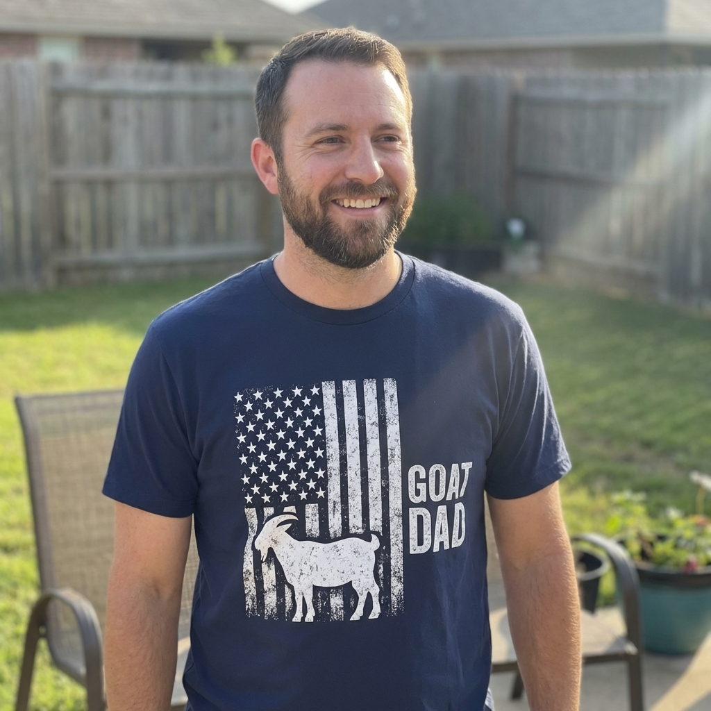 The GOAT Dad design celebrates the passionate bond between fathers and their beloved farm animals, expressed with a patriotic American spirit.