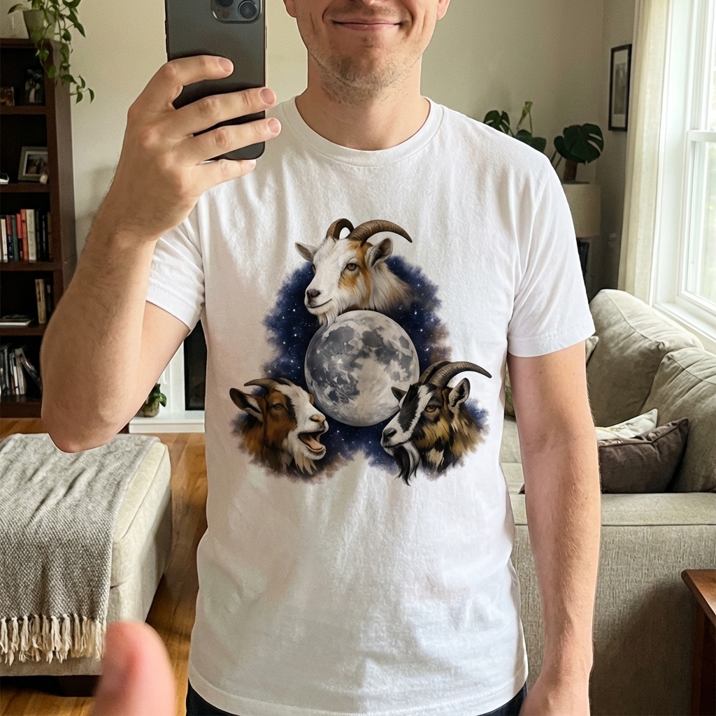 This mystical design captures the essence of curious goats exploring a cosmic night under the glow of a full moon.