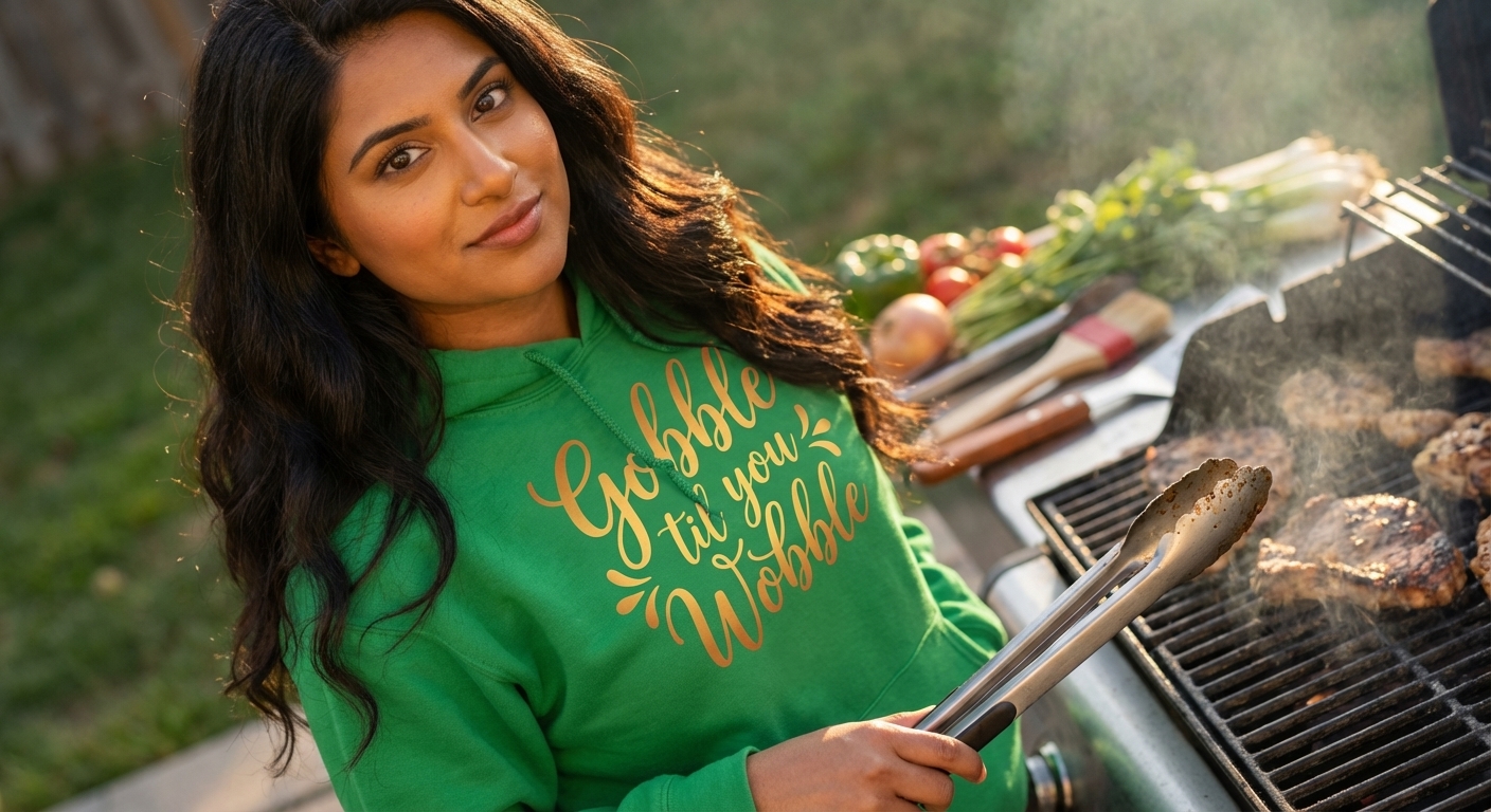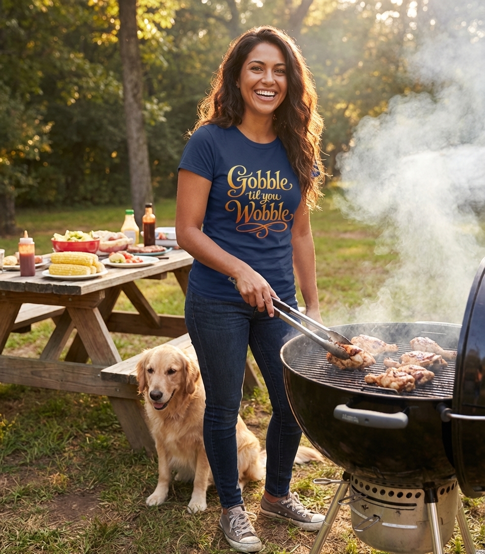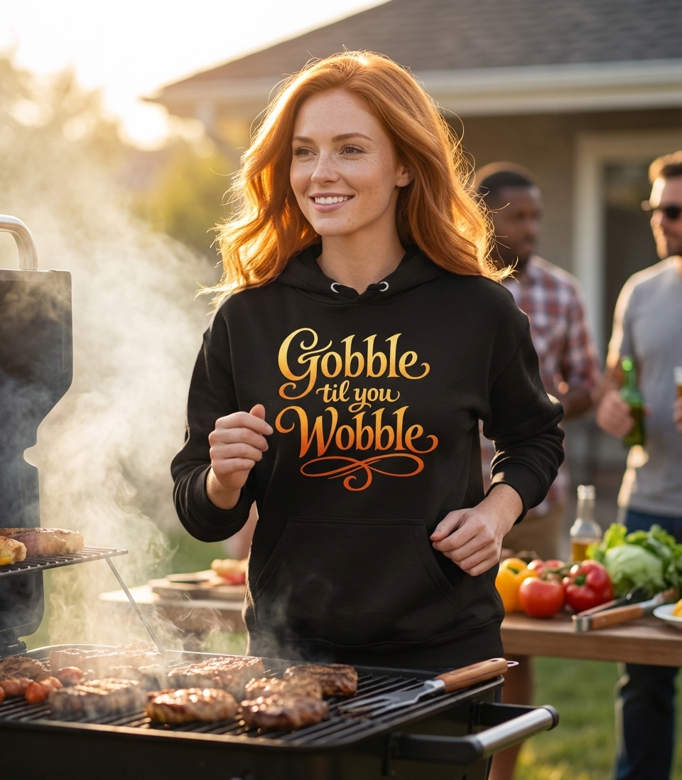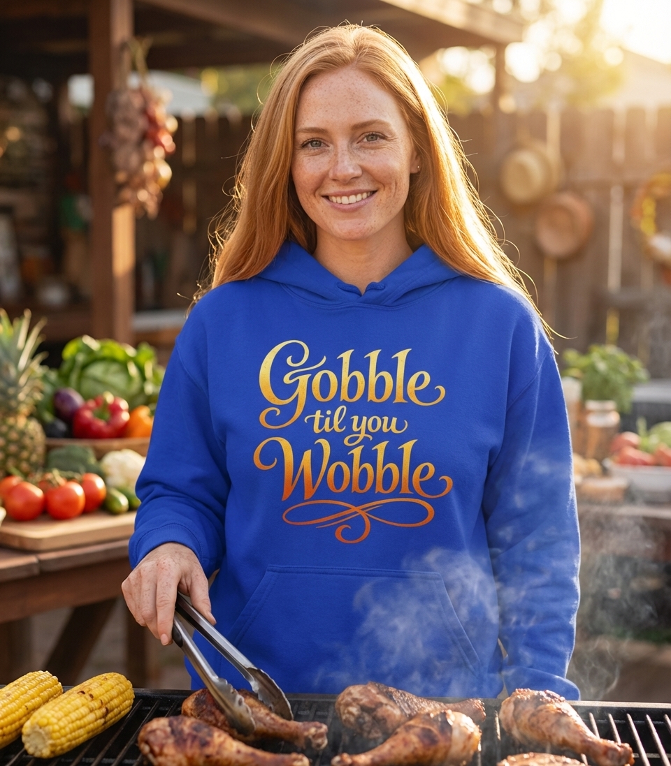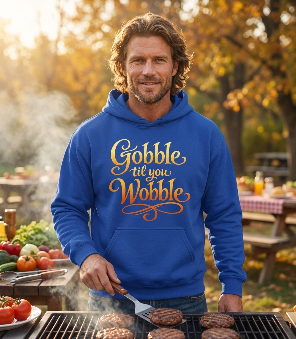 The "Gobble til you Wobble" phrase captures the lifestyle of passionate food lovers who feast during holidays, share laughter, and celebrate togetherness.
