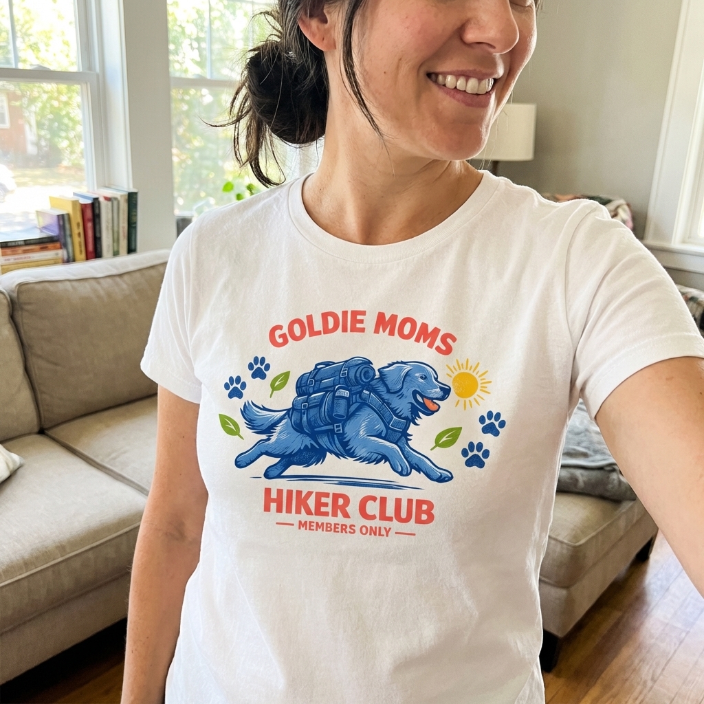 The "Goldie Moms Hiker Club" phrase captures the lifestyle of passionate Golden Retriever owners who spend their days trekking trails, exploring nature, and enjoying outdoor adventures with their furry companions.