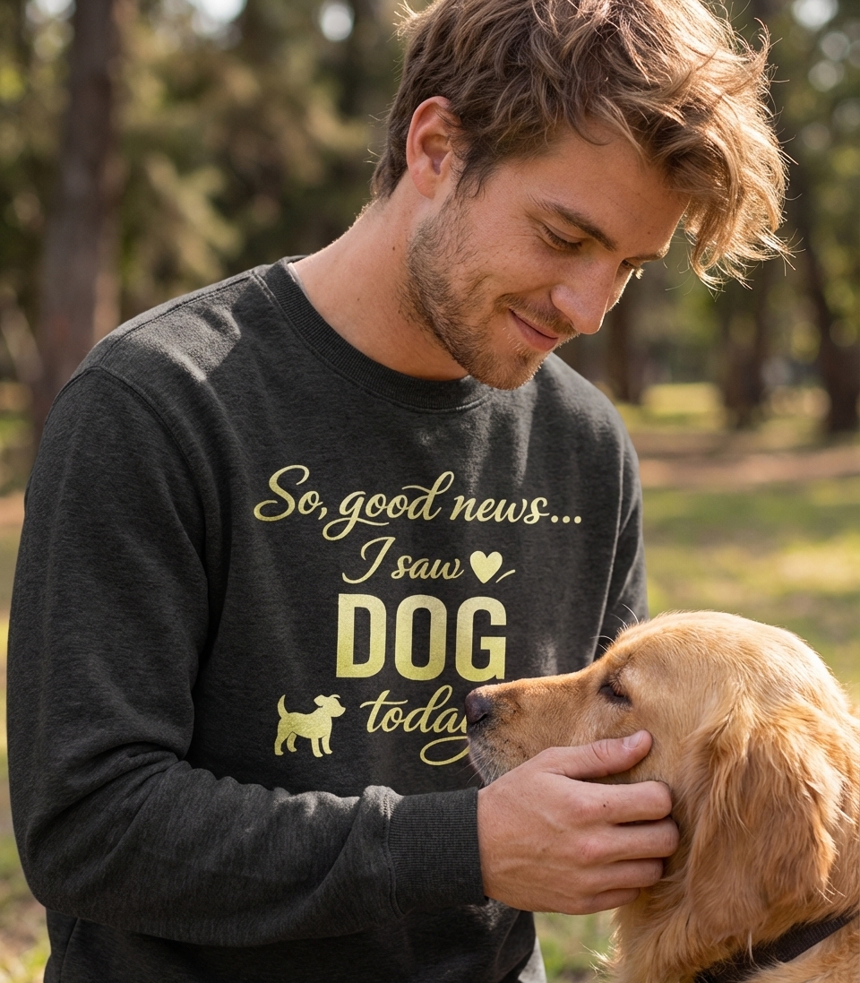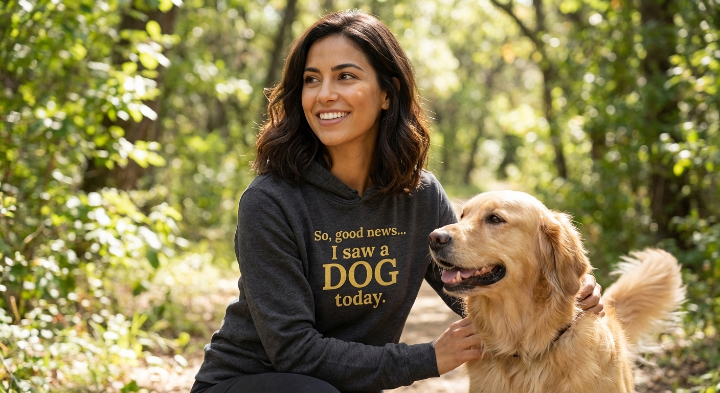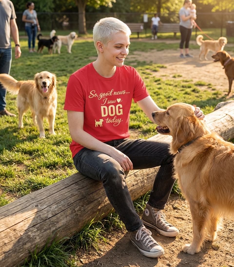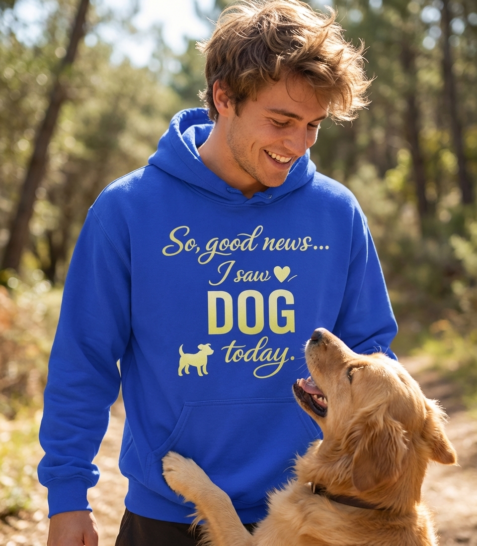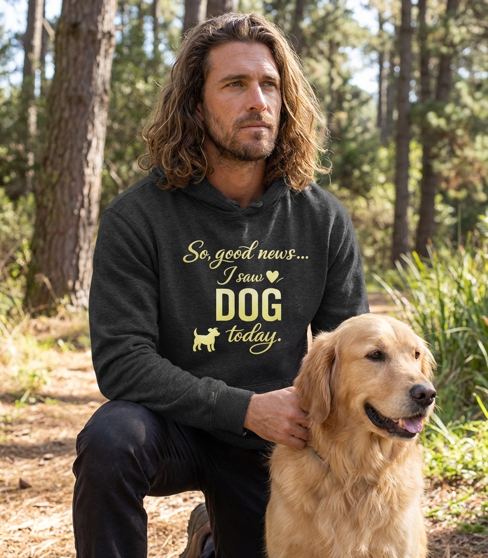 The 'So, good news... I saw DOG today.' phrase captures the lifestyle of passionate dog lovers who find pure joy in everyday encounters with their canine companions.