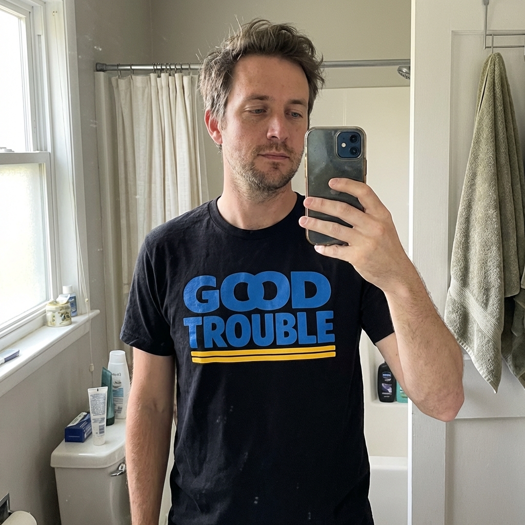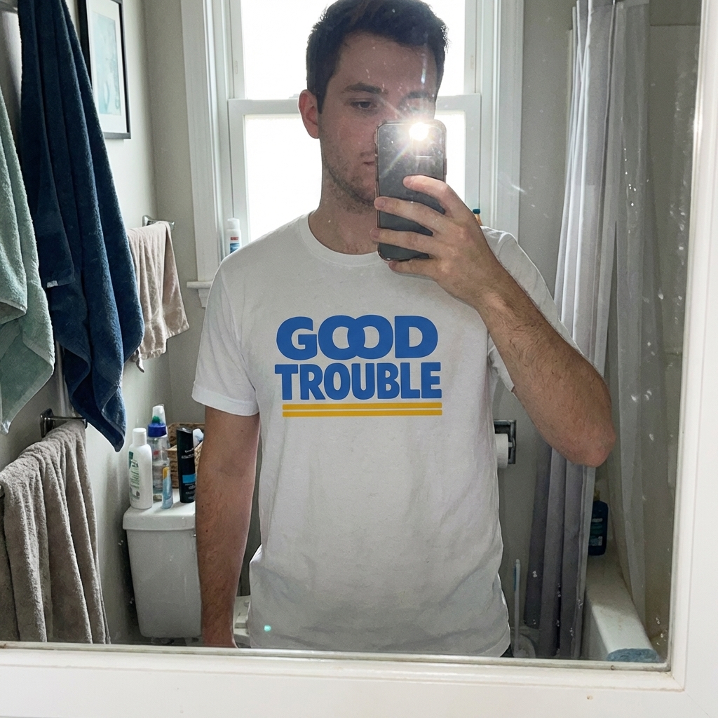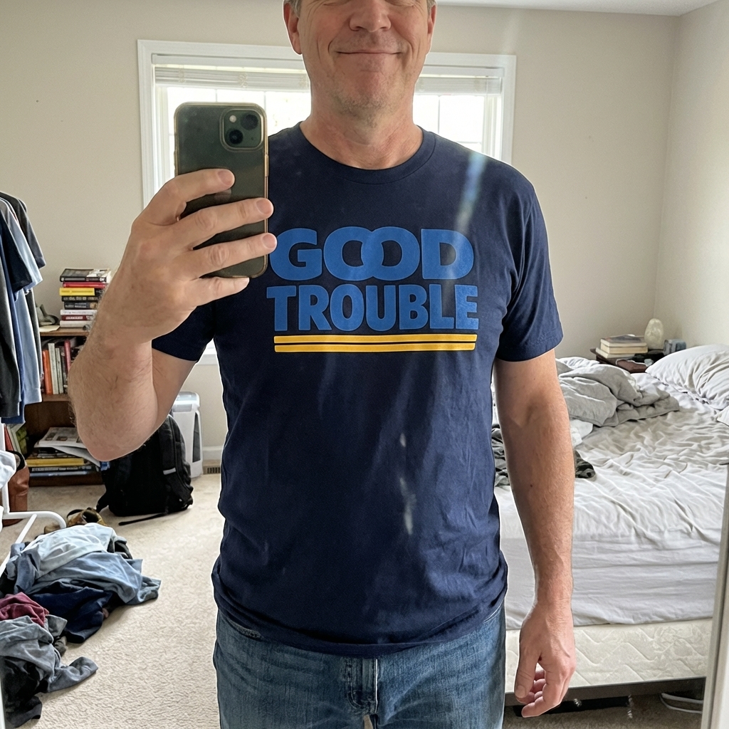 Love this shirt! The fabric is super soft, and the "Good Trouble" message comes through perfectly with that cool abstract design. It's quickly become one of my go-to's, definitely recommend.