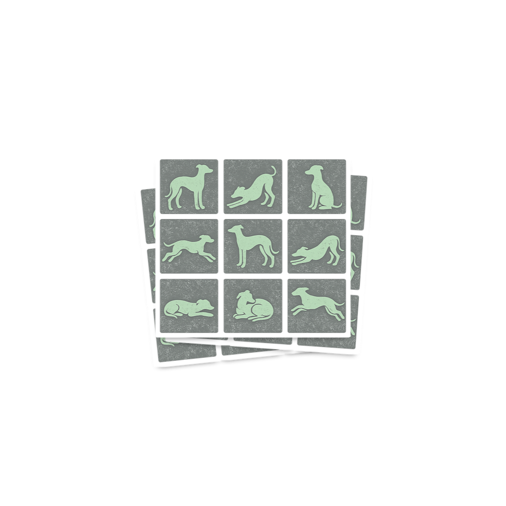 The artwork is a flat graphic utilizing a muted mint green for the greyhound silhouettes set against nine textured grey squares arranged in a 3x3 grid. The style is minimalist and clean, with a tranquil and appreciative mood that highlights the graceful forms and distinct movements of the breed.