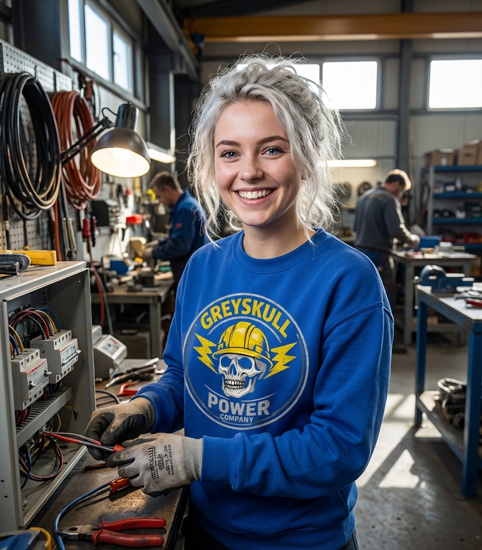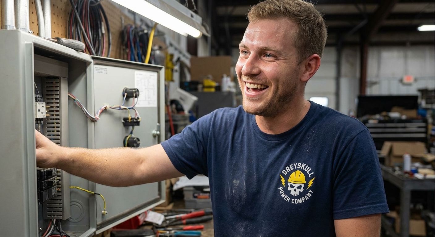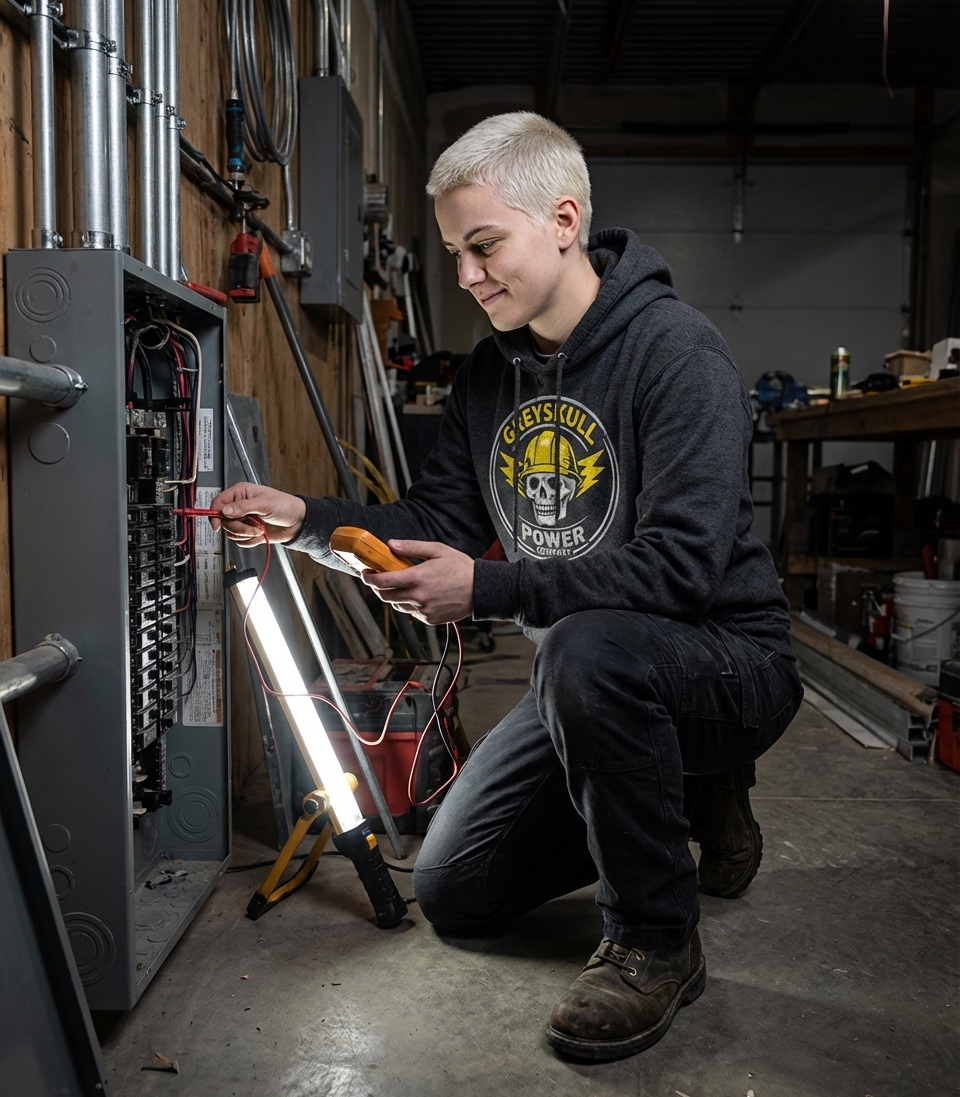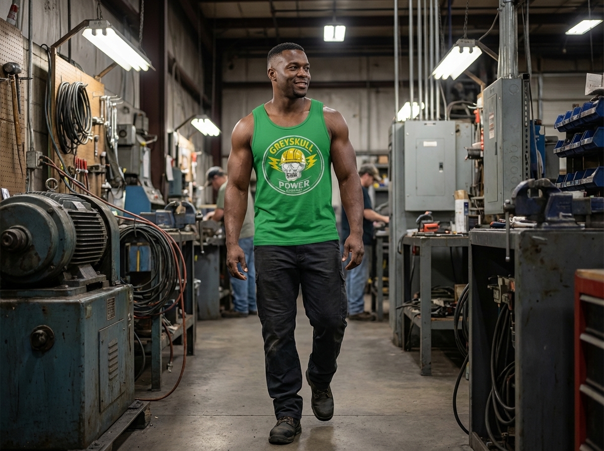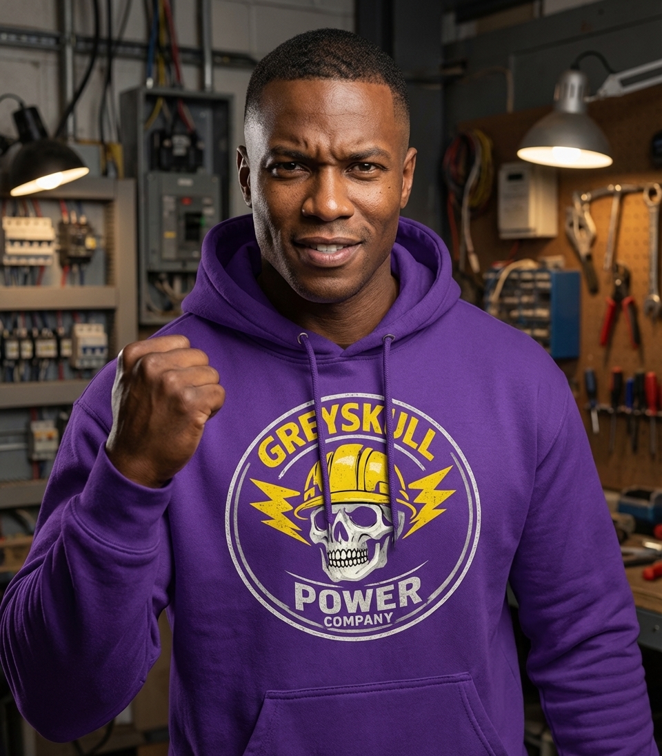 The Greyskull Power Company design captures the lifestyle of dedicated electricians and power workers who illuminate our world, maintain critical infrastructure, and ensure safety.
