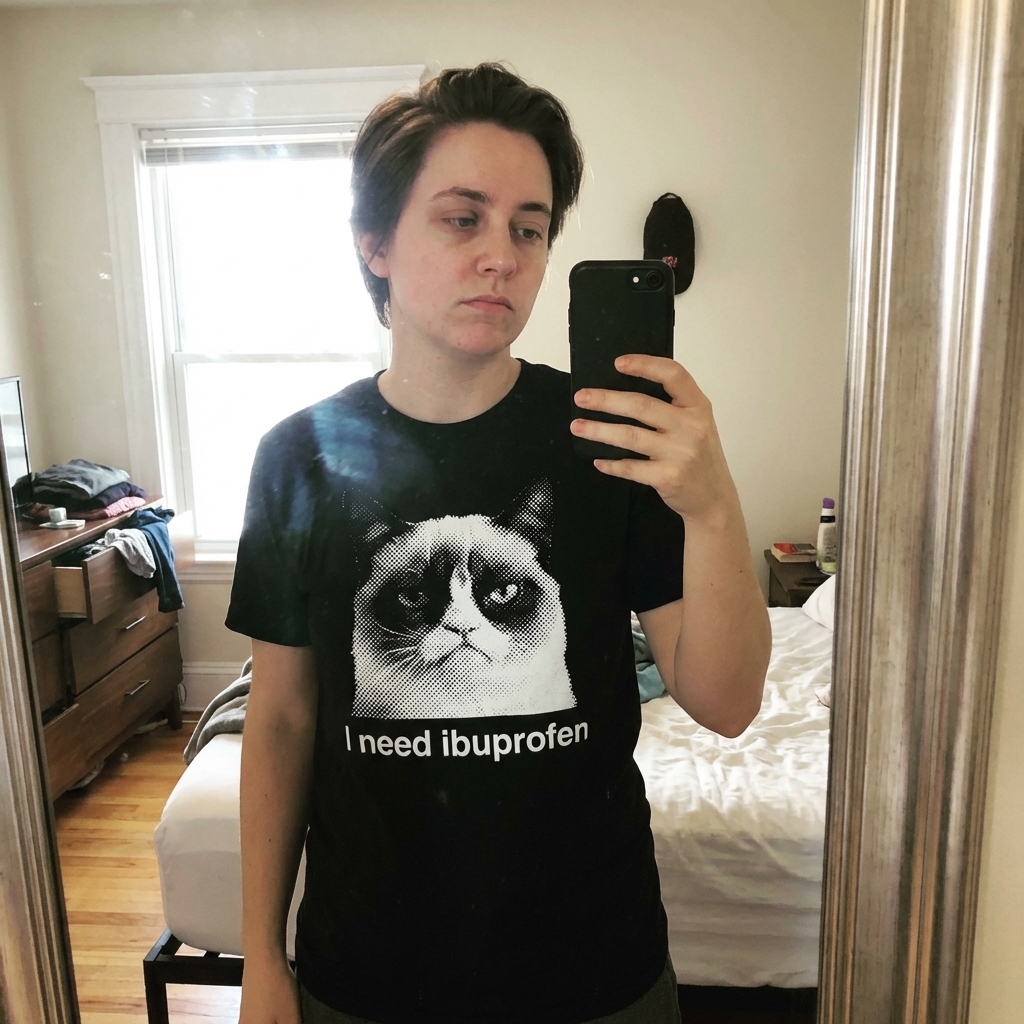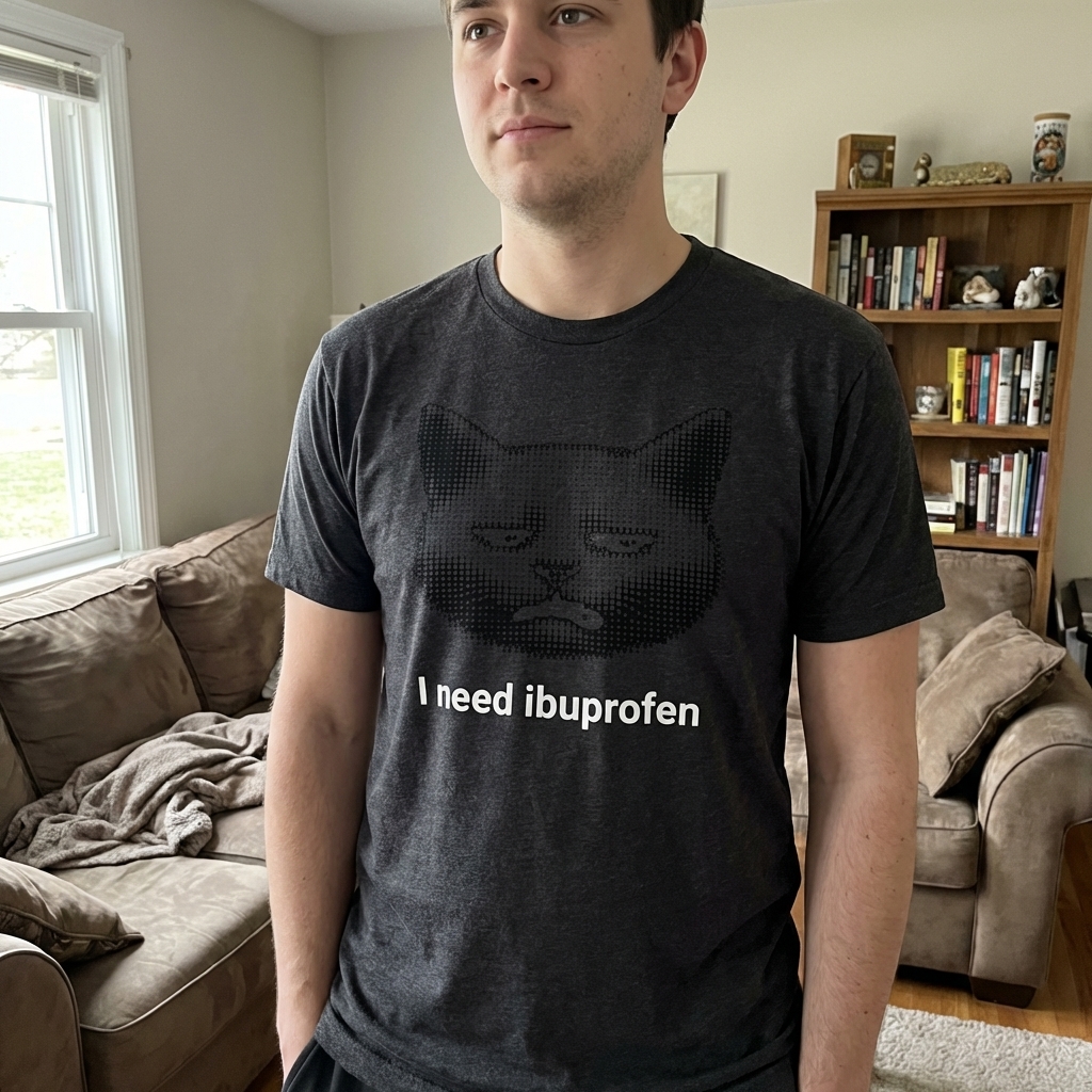 this shirt is pretty great, honestly. the grumpy cat ibuprofen design is hilarious and surprisingly stylish, plus the material feels super soft on. definitely happy with this purchase, gonna get a lot of wear out of it!