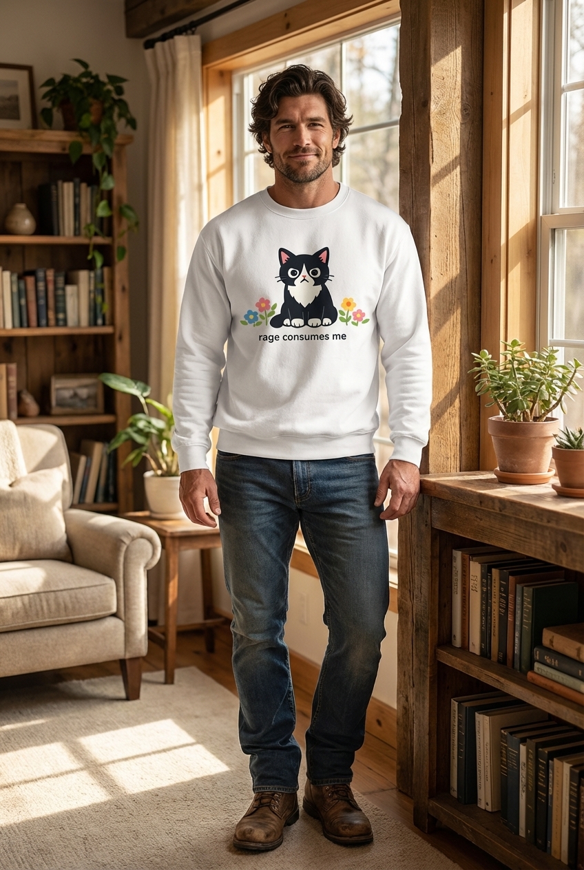 This design features a charmingly disgruntled tuxedo cat, stylized in a cartoon art form, sitting amidst cheerful and colorful flowers. The stark contrast between the cat's perpetually grumpy expression and its vibrant surroundings adds to the overall comedic effect. The phrase "rage consumes me" sits below the cat, perfectly encapsulating its mood.