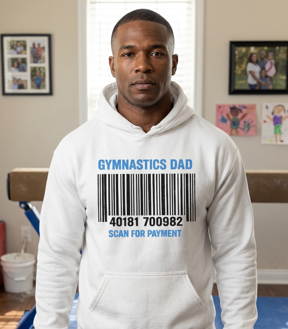 This design humorously depicts the role of a gymnastics dad, highlighting the significant commitment involved. It features a stylized barcode with a numeric code, implying the financial aspect of supporting a child's gymnastics journey. The bold, clean typography ensures the message is clear and relatable.