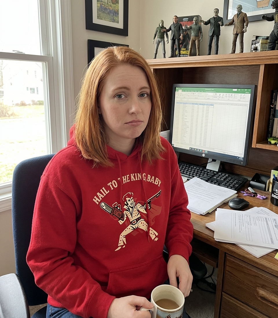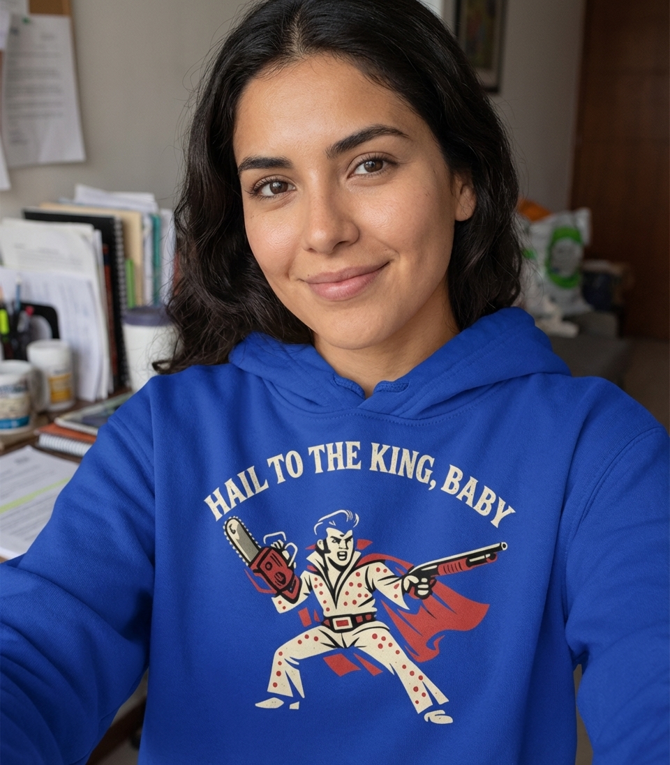 The "Hail to the King, Baby" phrase captures the lifestyle of passionate fans who love horror-comedy, retro aesthetics, and iconic pop culture references.