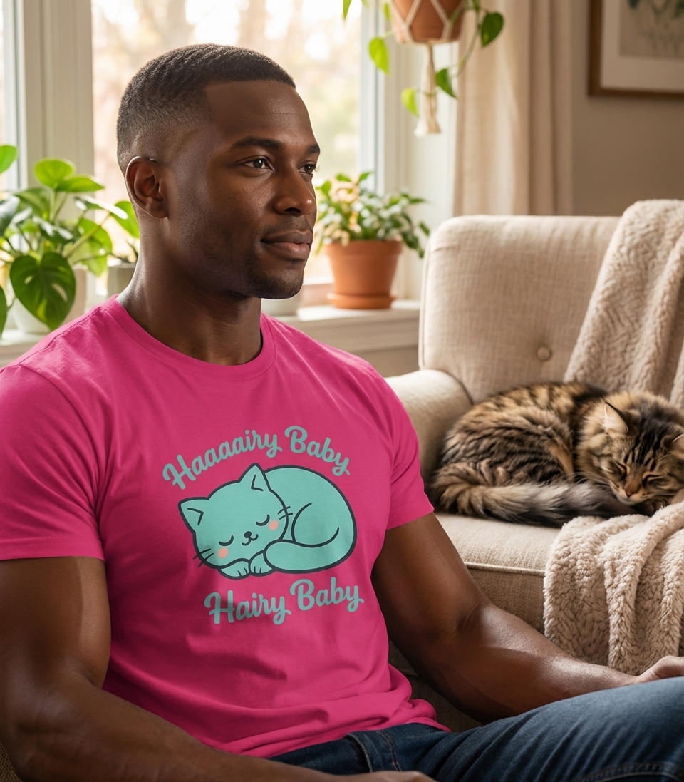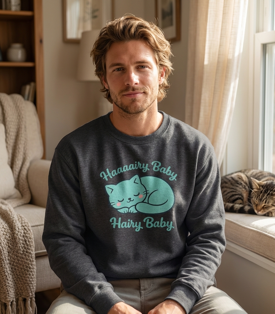 The 'Hairy Baby' phrase captures the lifestyle of devoted cat owners who adore their furry companions, cherish their naps, and celebrate their playful nature.