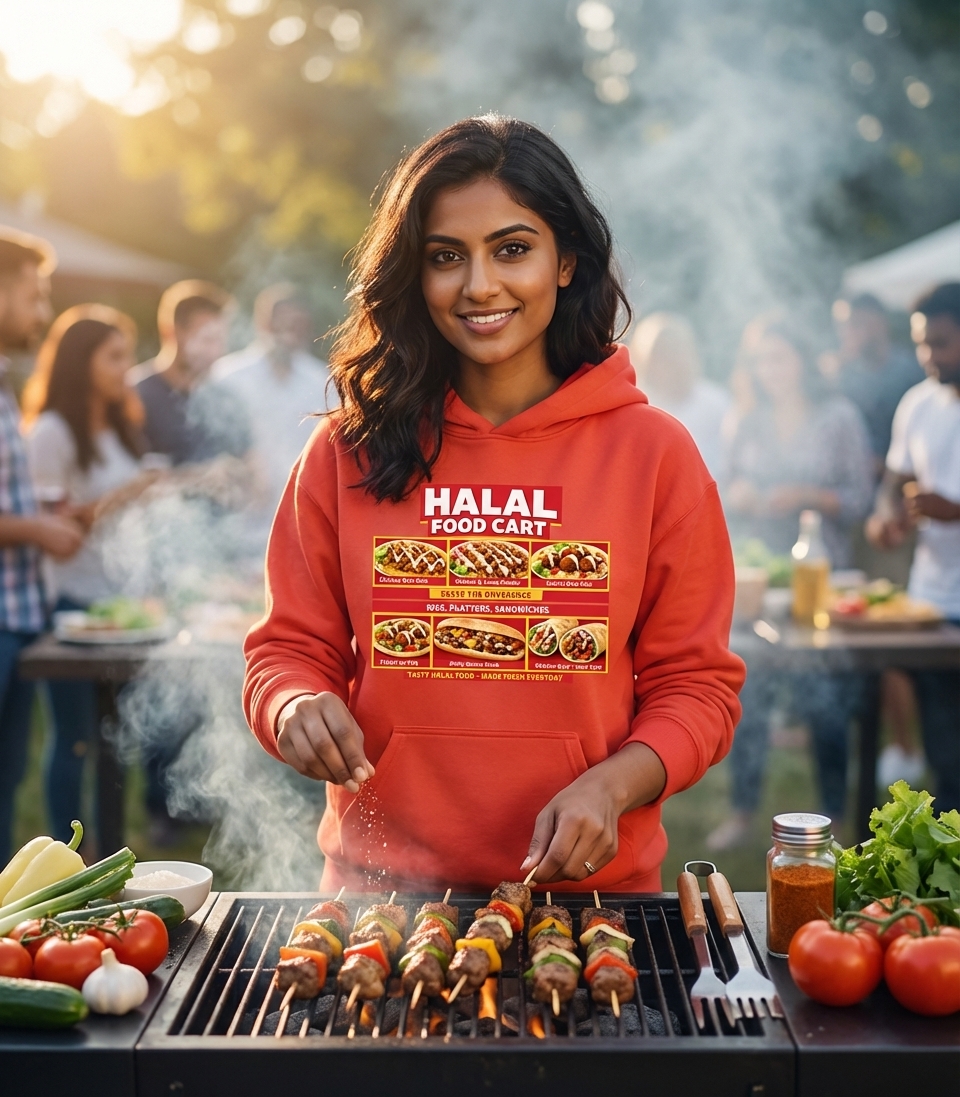 The "Halal Food Cart" design captures the lifestyle of passionate street food enthusiasts who appreciate diverse flavors, quick meals, and vibrant culinary experiences.