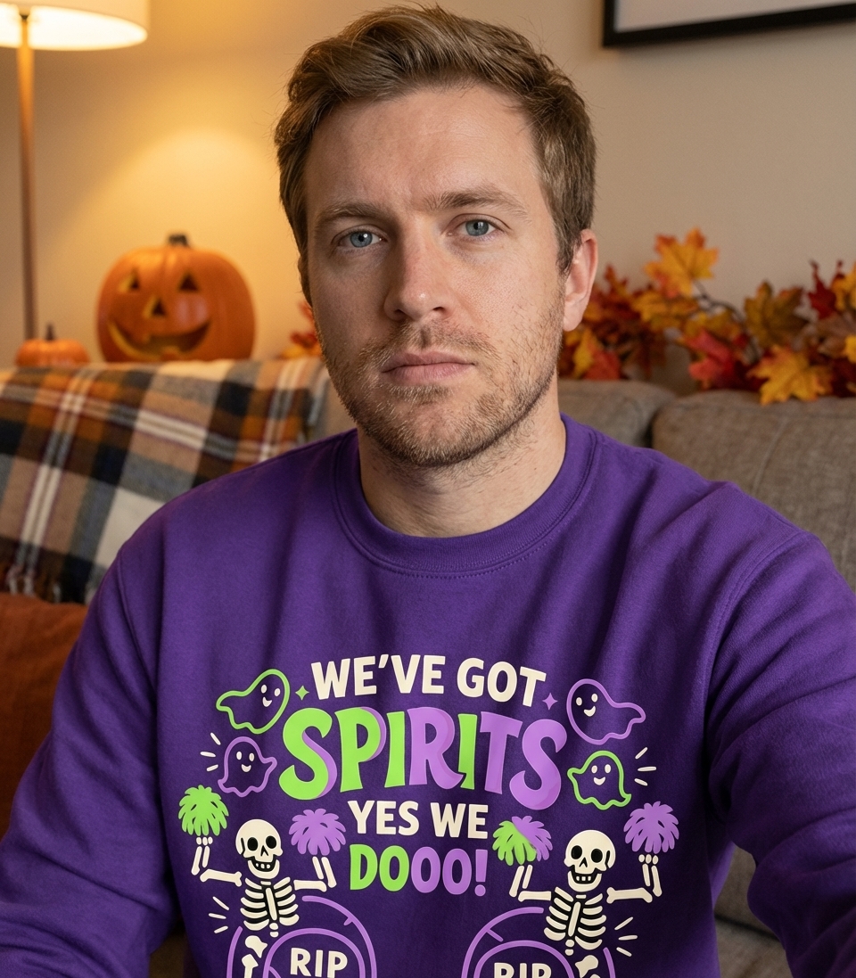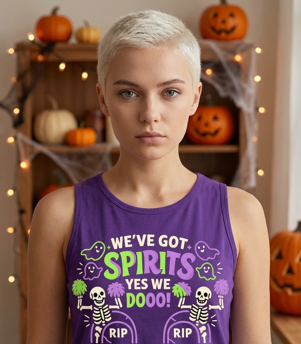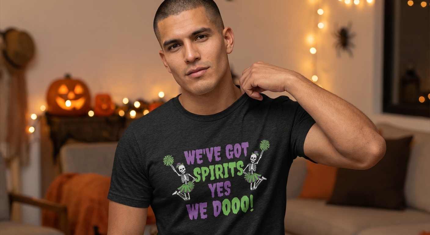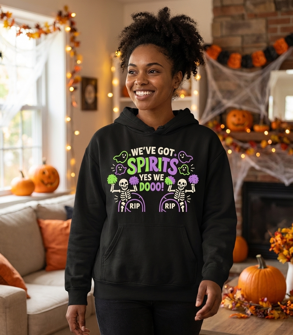 The 'We've Got Spirits' phrase captures the energetic lifestyle of Halloween enthusiasts who love spooky fun, cheerleading puns, and celebrating the haunted season.