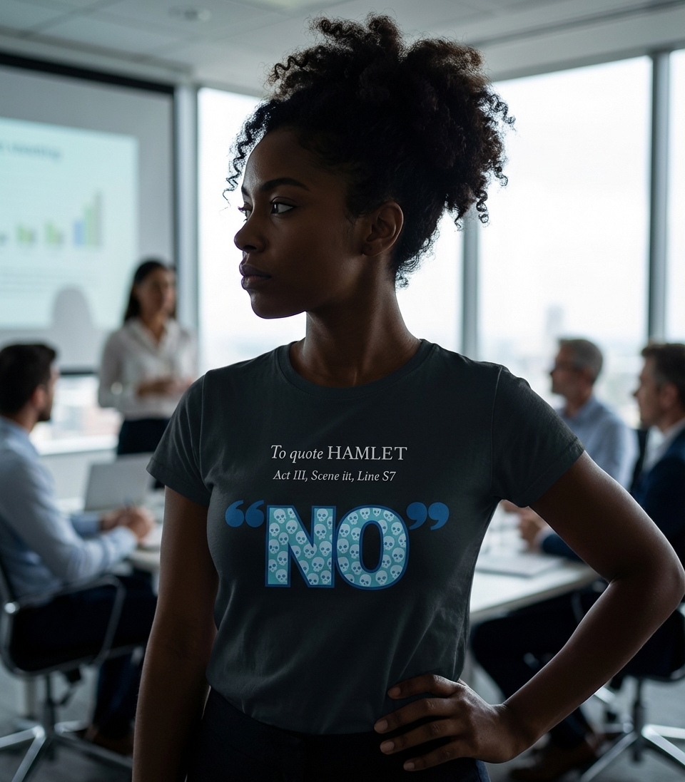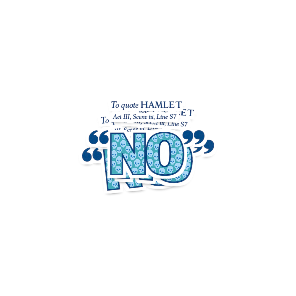 The phrase 'To quote HAMLET Act III, Scene iii, Line S7 "NO"' is a comedic twist on academic citation, implying that even a profound literary work like Hamlet can be distilled to a simple, emphatic refusal. It pokes fun at over-analysis while delivering a universally understood message. The skulls add a touch of Hamlet's iconic themes of mortality and existentialism, enhancing the satirical tone.