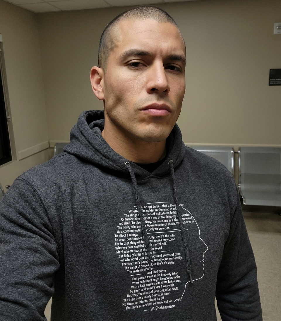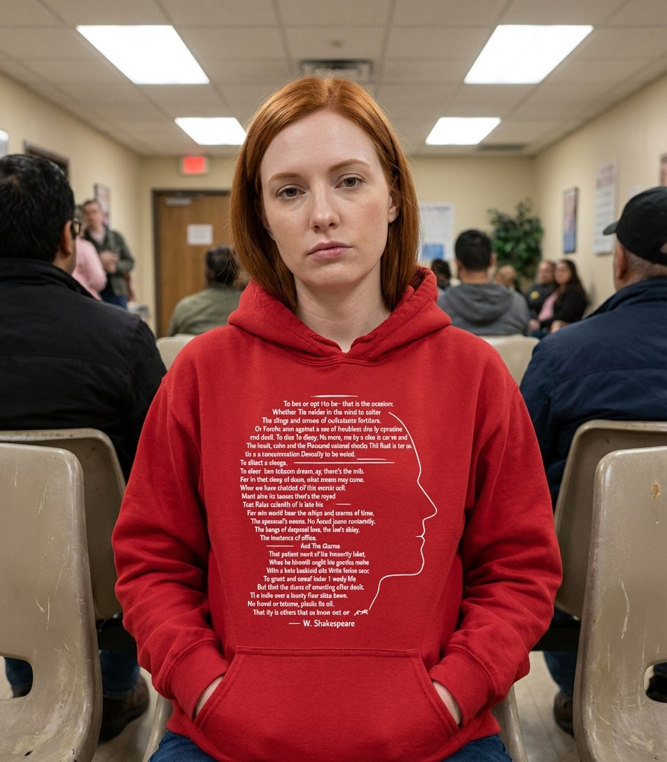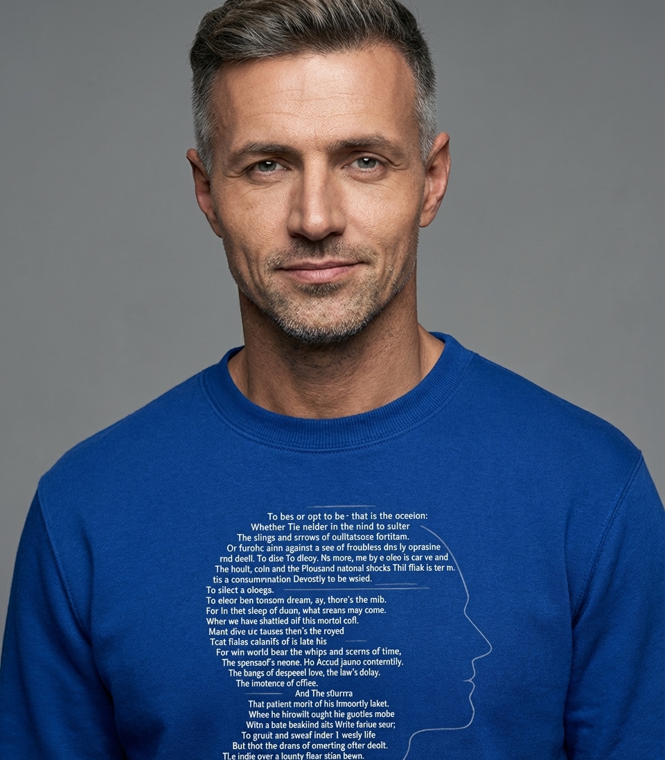 This distinctive design features a minimalist silhouette of a human profile, artfully filled with text. The internal text is a stylized and intentionally garbled rendition of Hamlet's famous 'To be or not to be' soliloquy. It offers a unique visual interpretation of a classic literary piece.