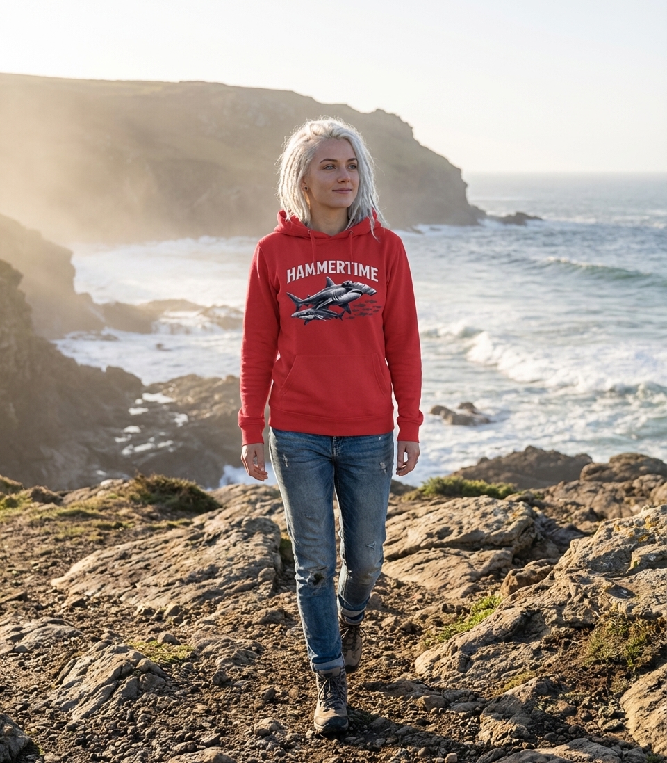 The phrase "HAMMERTIME" is a playful double entendre, directly referencing the hammerhead sharks featured in the artwork. It also evokes the popular idiom, suggesting it's a moment for action or an energetic, fun occasion, making it a unique statement for marine life admirers.