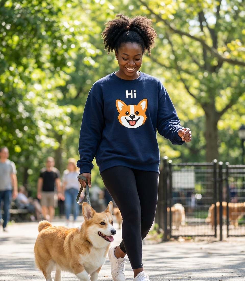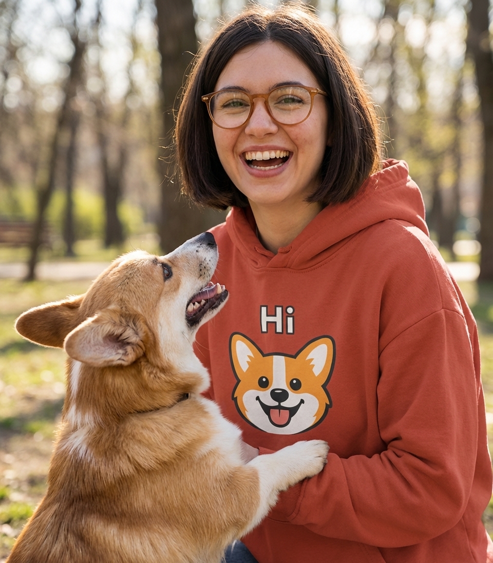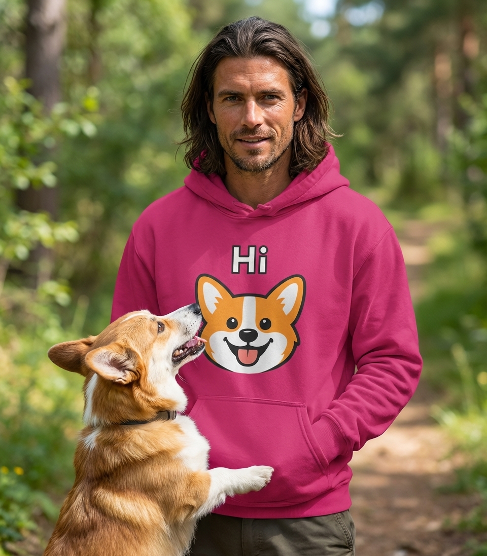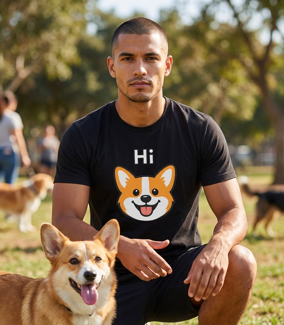 This adorable Corgi design captures the friendly spirit of dog lovers who greet every day with a wagging tail, a happy smile, and a playful 'Hi!'