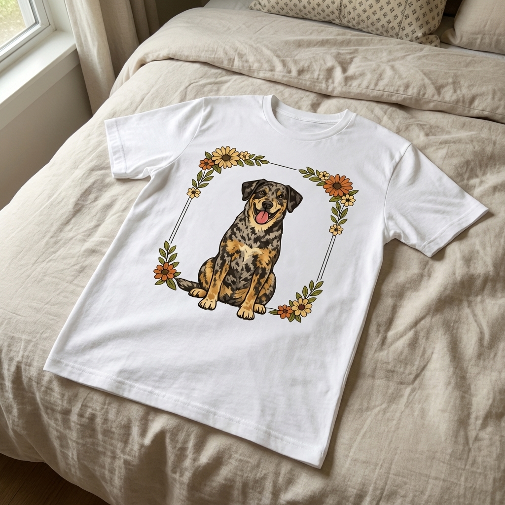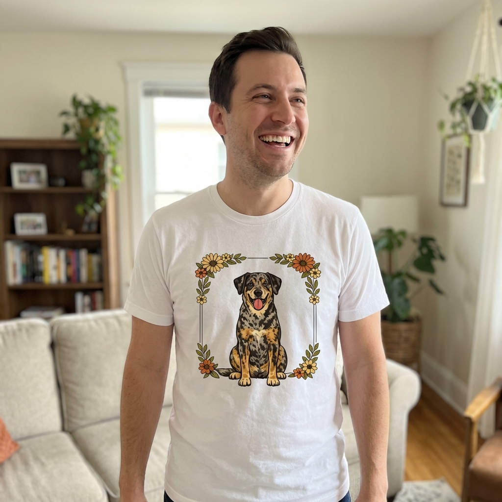 Okay, so this "Happy Floral Dog" shirt just arrived and omg, it's adorable. The fabric feels really soft, and the print quality is great – definitely a cheerful addition to my wardrobe.