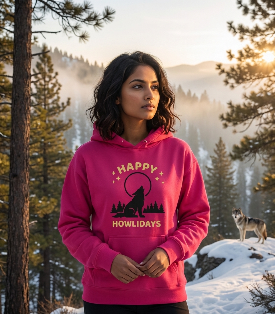 The 'Happy Howlidays' phrase captures the festive spirit of wildlife enthusiasts and pun lovers who enjoy winter nights, forest adventures, and unique seasonal greetings.