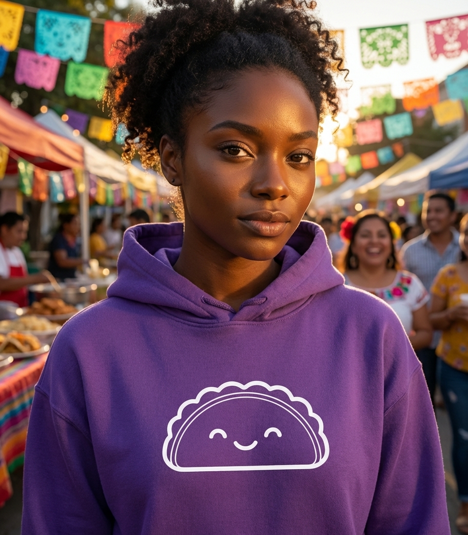 This cheerful happy taco design captures the lifestyle of food enthusiasts who love Mexican cuisine, simple graphics, and a friendly culinary vibe.