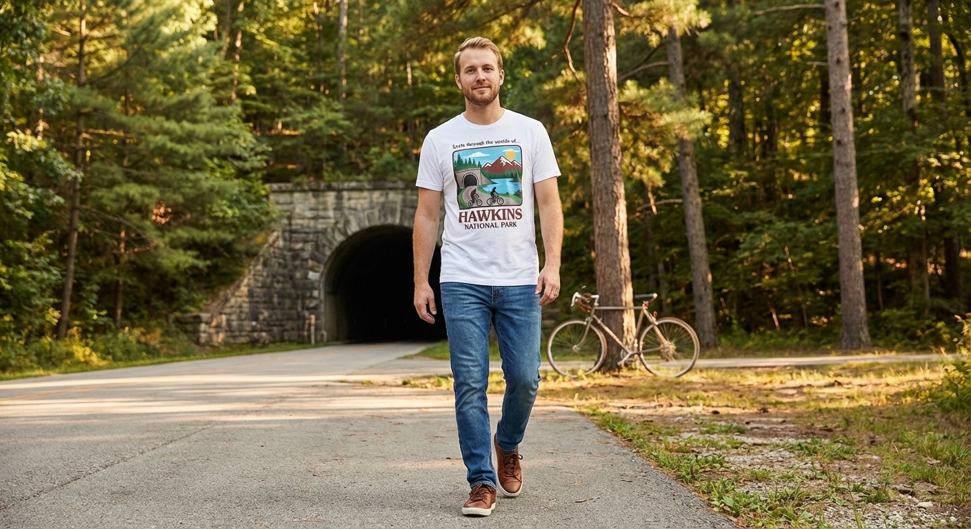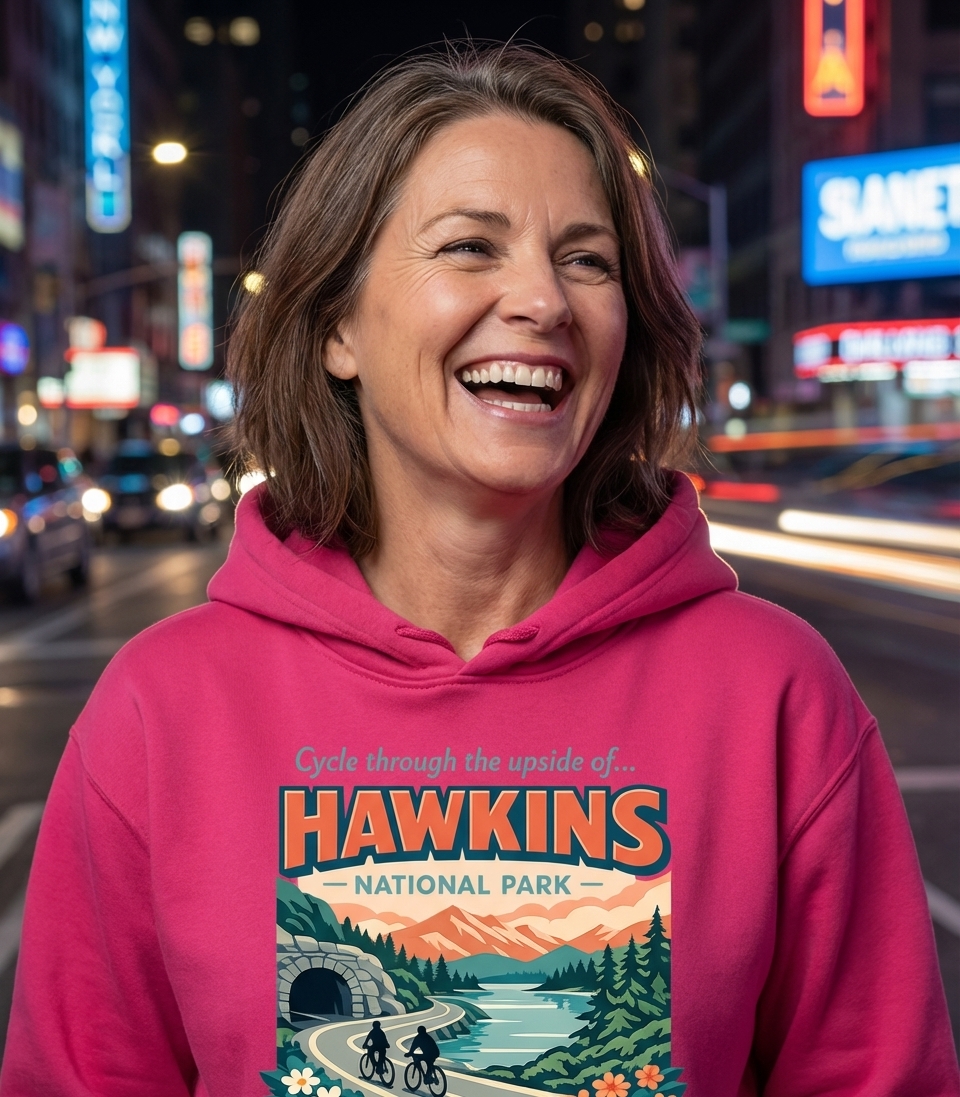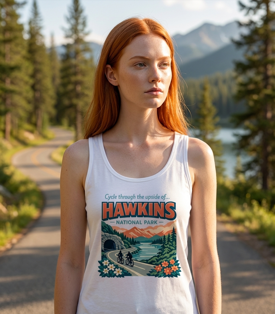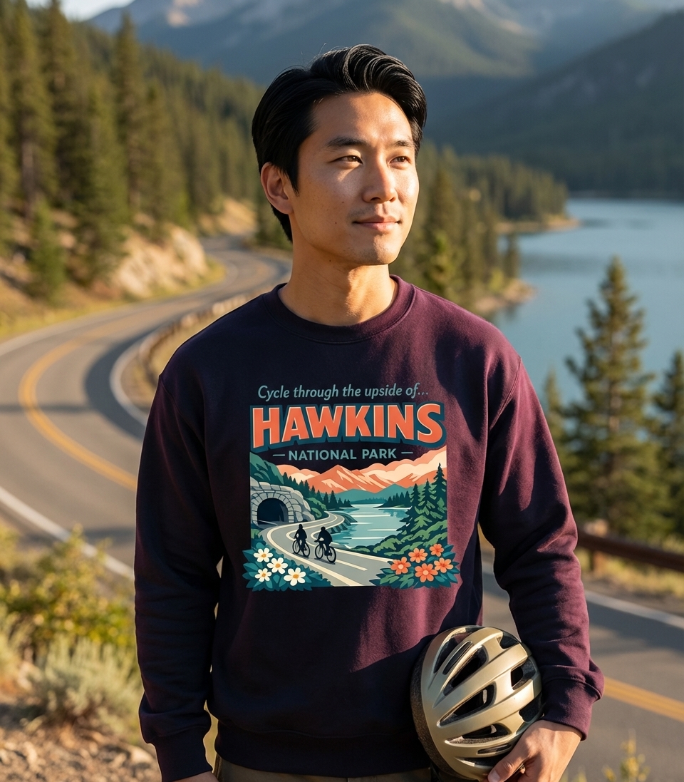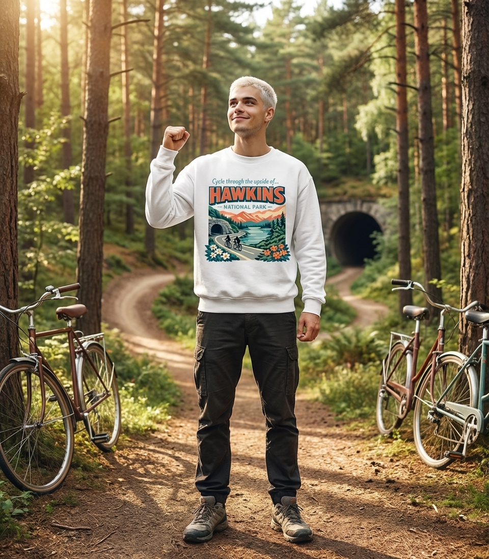 The "Cycle through the Upside of Hawkins" phrase captures the adventurous spirit of fans who explore the fictional world of Stranger Things, imagining a bike ride through its mysterious landscapes.