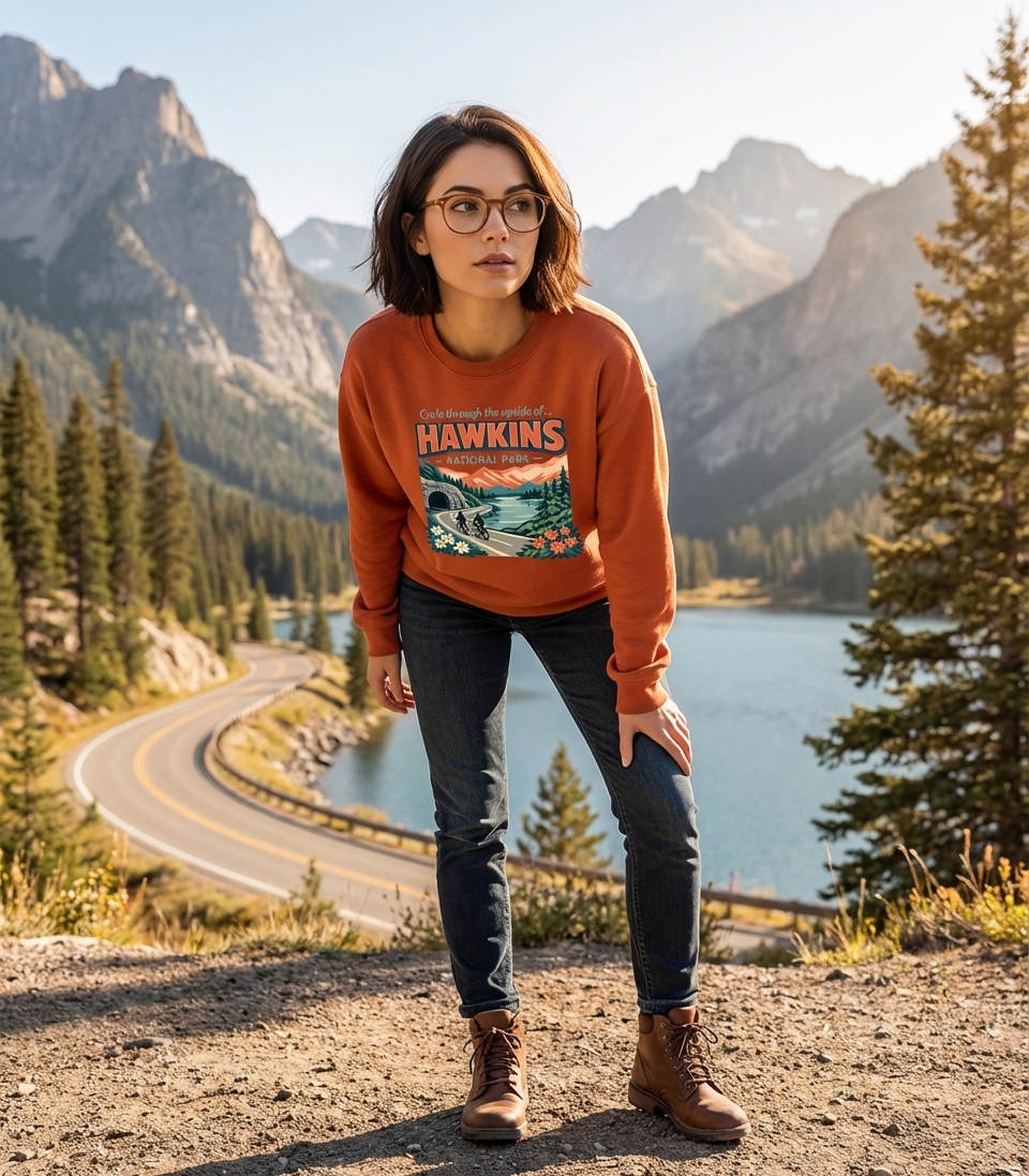 The phrase "Hawkins National Park" and the reference to "the upside of..." cleverly allude to the popular science fiction horror series, Stranger Things. It plays on the show's fictional town of Hawkins, Indiana, and the alternate dimension known as the "Upside Down," inviting fans to imagine a picturesque, yet mysterious, version of this iconic location.