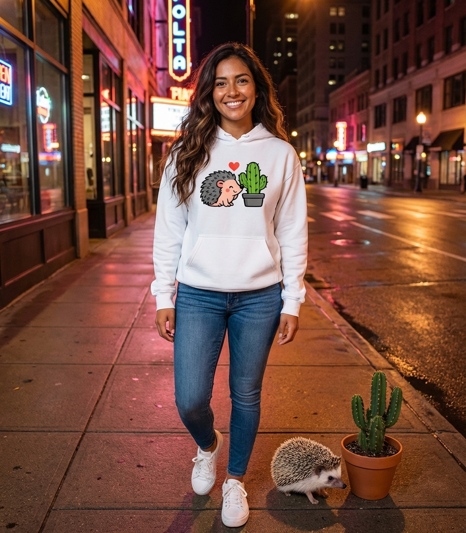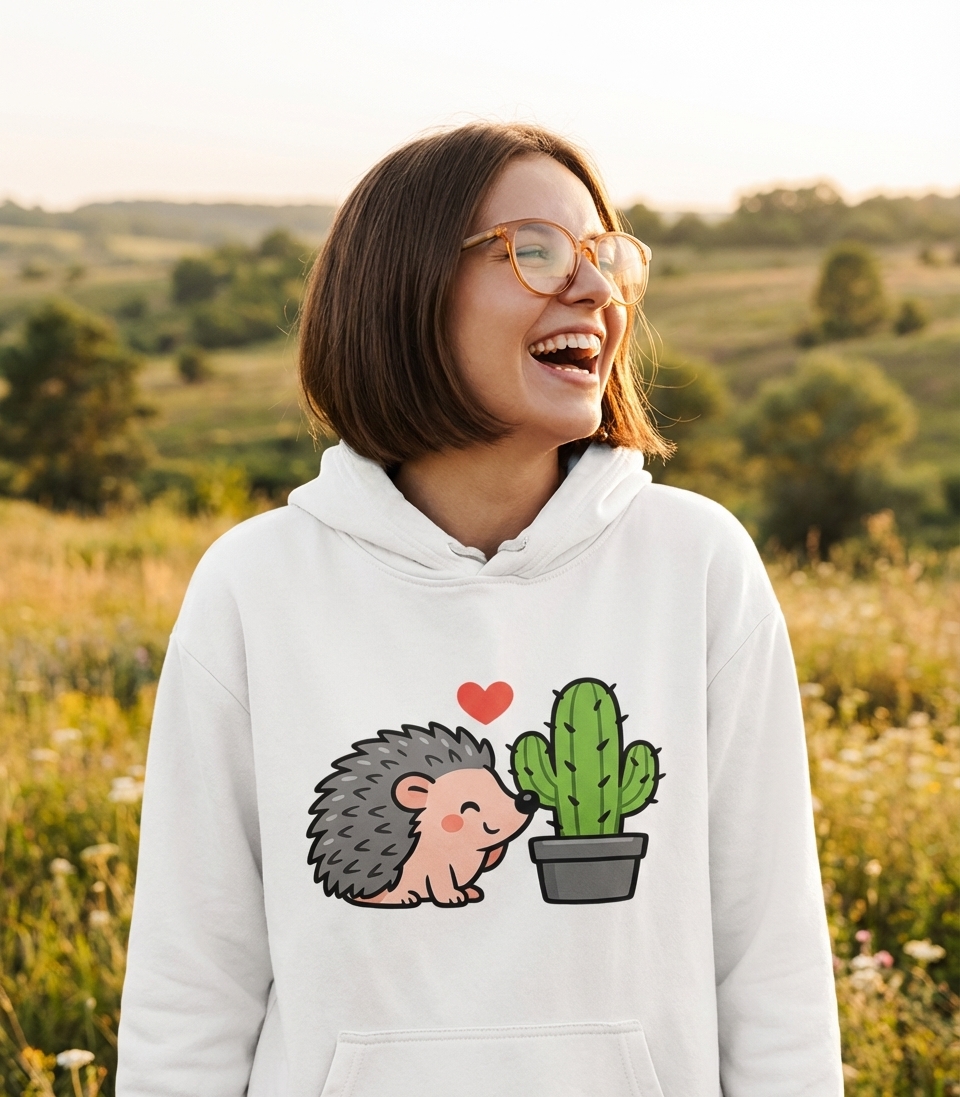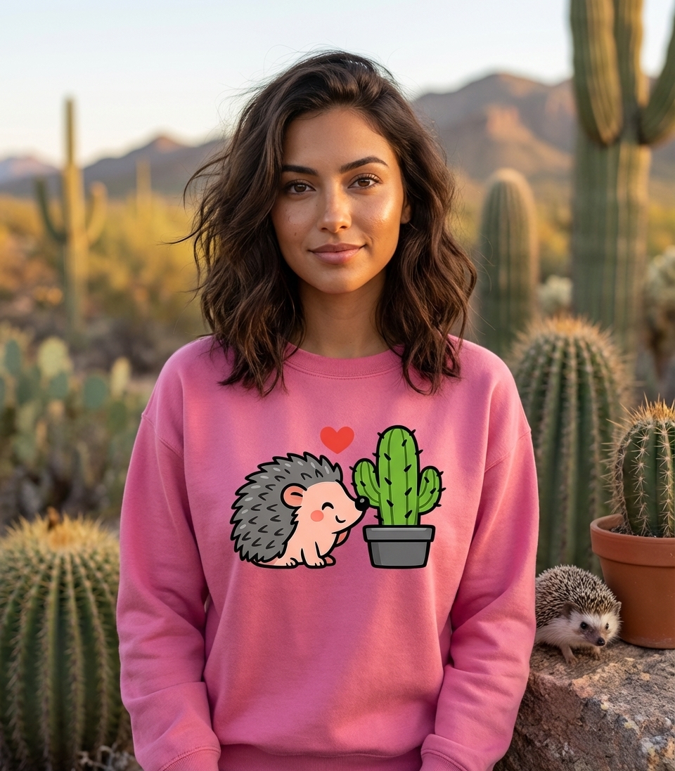 This adorable design captures the sweet, gentle connection between a cute hedgehog and a prickly cactus.